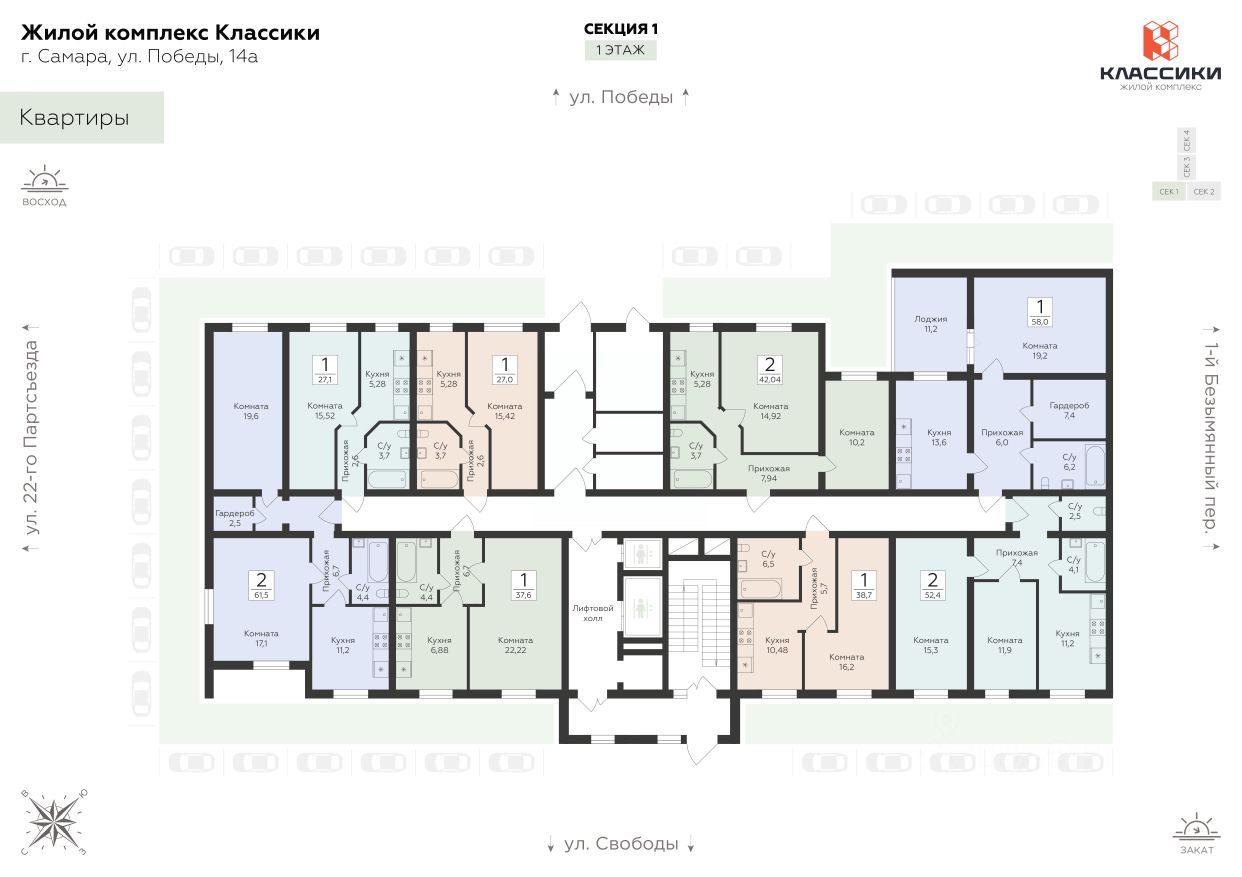 Ипотечные программы:1. Семейная 3,5%, 2. Рассрочка 0% до конца строительства с первоначальным взносом 30%. Продаётся 1 комнатная квартира 481 в строящемся жилом комплексе ''Дом у Космопорта 2'',. ЖК ''Дом у Космопорта 2'' располагается в географическом центре города. И, в тоже время, вблизи четырех парков. Поблизости размещены 4 школы и 2 детских сада. Торговые центры ''Космопорт'', ''Аврора Молл'' и центр мебели ''DOM''. Остановки общественного транспорта и метро.Срок сдачи всего комплекса: II-кв. 2026Жилой комплекс ''Дом у Космопорта 2'' это современный жилой комплекс, расположенный в самой высокой точке города Самара 142 м над уровнем моря. Всего 30 метров до новой школы и нового детского садика, плюс в шаговой доступности расположены еще 4 школы и 2 детcких caдa. Состоит из пяти 27-ти этажных секций с нежилыми помещениями на первых этажах, двух 2-х этажных нежилых секции и двумя уровнями подземной автопарковки, доступ к парковочной зоне из грузового лифта.Жилой комплекс представляет собой многосекционное монолитно-кирпичное здание. Застройщиком спроектированы квартиры с различными планировками: от одно- до трехкомнатных квартир, двухэтажные квартиры и квартиры с собственными верандами общей площадью от 44,8 до 155 кв.м. Для достижения максимальной эргономики спроектировано минимум перегородок, что позволит легко сделать свою квартиру мечты.Благоустройство прилегающей территории включает в себя организацию детских и спортивных площадок, зон отдыха и озеленение. Предусмотрены открытые гостевые парковки и подземный паркинг. В шаговой доступности находятся школы, детские сады, медицинские учреждения, аптеки и продовольственные магазины.Уникальные преимущества ЖК Дом у Космопорта 2:- Универсальные планировки,- Собственная экосистема ЖК,- Бесплатный Wi-Fi во дворе,- Велопарковка,- Витражное остекление лоджий,- Безбарьерная среда,- Видеонаблюдение и IP-домофония,- Подземный паркинг,- Двухуровневые квартиры,- Высокие потолки до 2,8 метров,- Светодиодные фонари на всей территории,- Благоустроенный двор,- Workout площадка,- Широкие лоджии,- 3 лифта производителя Otis в каждом подъезде (2 из них грузовые),- Индивидуальный узел учета тепла,- Разводка отопления по полу,- Грузовой лифт из паркинга,- Бесключевой доступ во двор,- Отделка на Ваш выбор,- Удобные входные группыСтроительство ведется в два этапа. Сдача 4 секции 2 квартал 2026 г.,