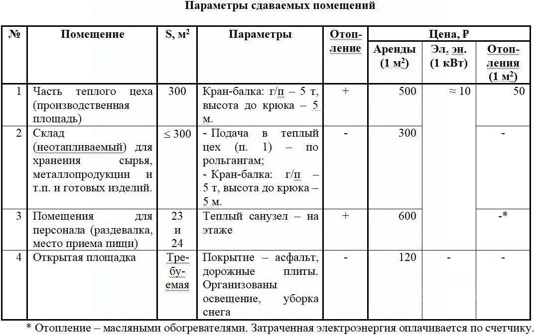 Аренда склада Аренда помещений под металлообработку и деятельность связанную с металлом! Помещения расположены по Ул. Береговая, удобными подъездными путями. Площадь 500 м. кв. - по свободным площадям уточняйте. Ворота 2 шт. размером 6*4 Высота потолка 10 м. Полы- дорожные плиты кран балки грузоподъемностью 5 Т. На территории выведены точки с водой Имеется доп. техника: Авто-кран ,стропальщики, погрузчик. Круглосуточная охрана :ЧОП, видеонаблюдение. Ж/Д ветка на соседнем участке Уборка территории. Возможна организация отдельного заезда для арендатора. Большая парковка на территории. Организован трансфер для сотрудников. Аренда от ООО без НДС Сдаваемые площади: -Часть теплого цеха (производственная площадь, ввод в эксплуатацию 2025 г.) для металлообработки. - S = 300 м2 ( 18 х 16 [м]). - Кран-балка (отдельная для арендатора): грузоподъемность 5 т, высота до крюка 5 м. - Стеллажи свободные из наличия. Склад (неотапливаемый, связан с производственной площадью из п. 2.1 рольгангами) Кран-балка (отдельная для арендатора): грузоподъемность 5 т, высота до крюка 5 м. 2 помещения (возможна сдача как обоих, так и любого одного): S = 23 м2 и S = 24 м2. Теплый санузел на этаже. Открытая площадка (в т.ч. для отстоя а/т). Покрытие асфальт, бетонные плиты. Организованы освещение, уборка снега. -Дополнительные услуги (кран, погрузчик, грузовой автотранспорт (в т.ч. с КМУ) и т.п.) по прайс-листу базы. В качестве арендатора рассматриваем только партнеров по рынку металлов производителей металлоконструкций и компании, оказывающие услуги по металлообработке. Вадим П. и Елена Т.