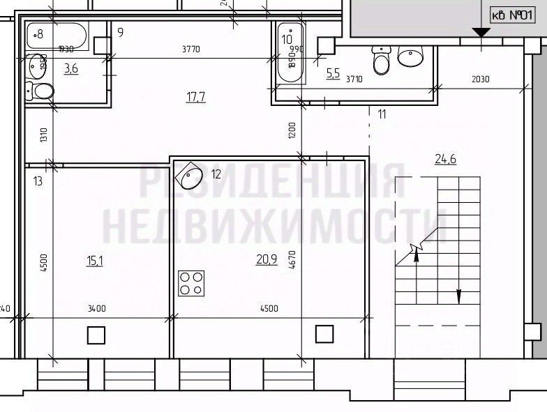 Квартира расположена на последнем этаже здания и разделена на 2 уровня.