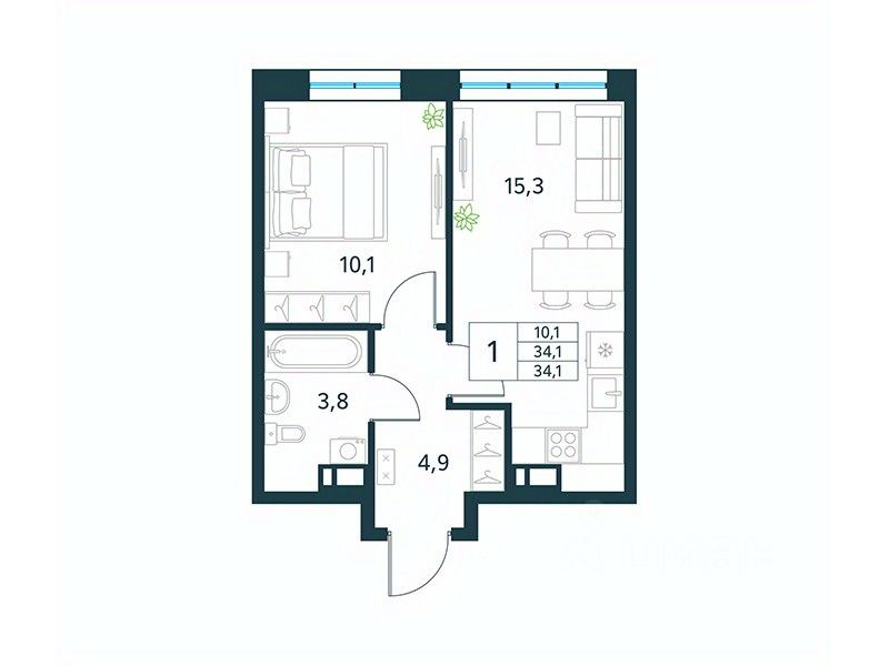 Продается 1-комн. квартира площадью 34,1 кв.м, без отделки. Квартира расположена на 3 этаже 18 этажного монолитного дома (Литер 1 (3 очередь), Секция 1) в ЖК ''Хороший'' от АТОЛЛ.
