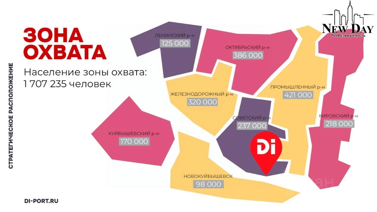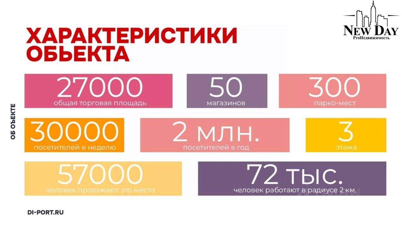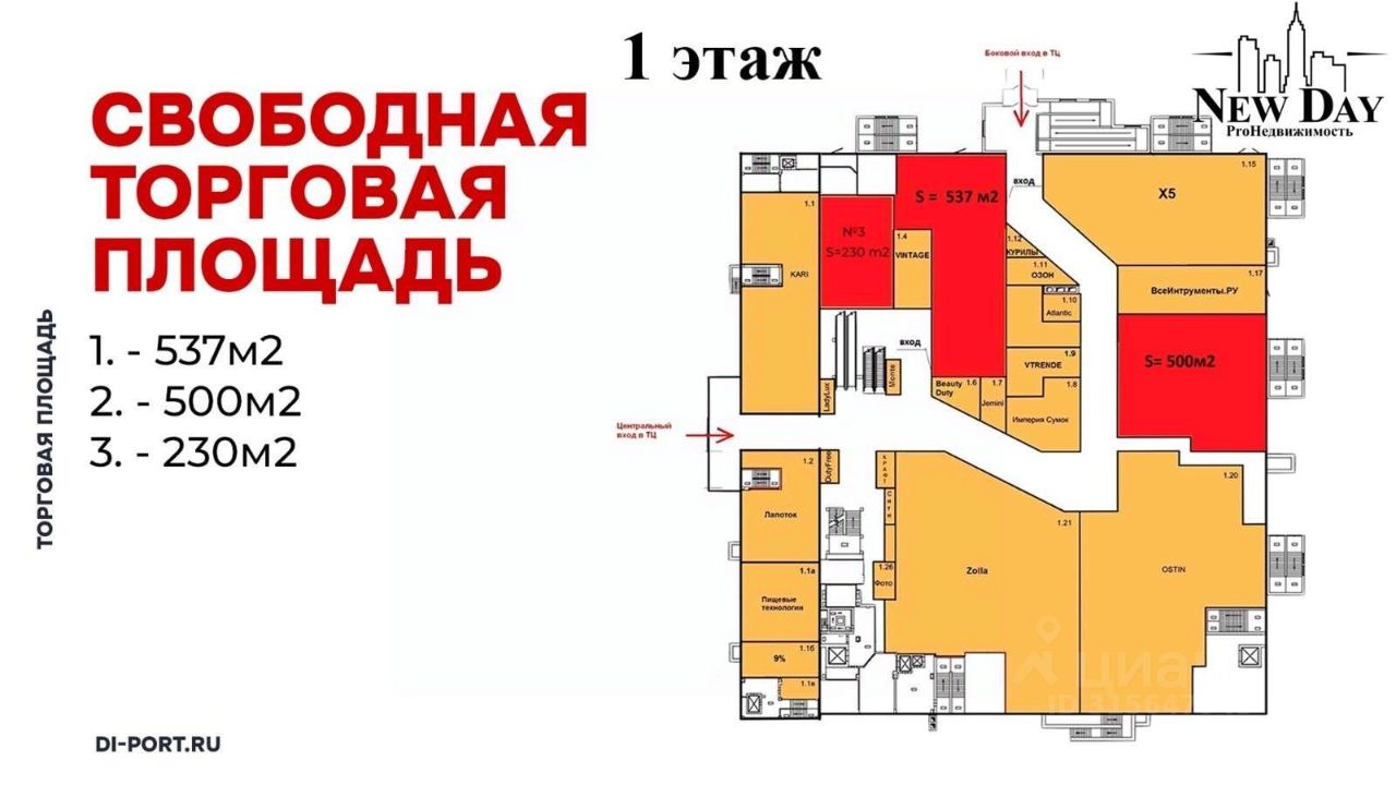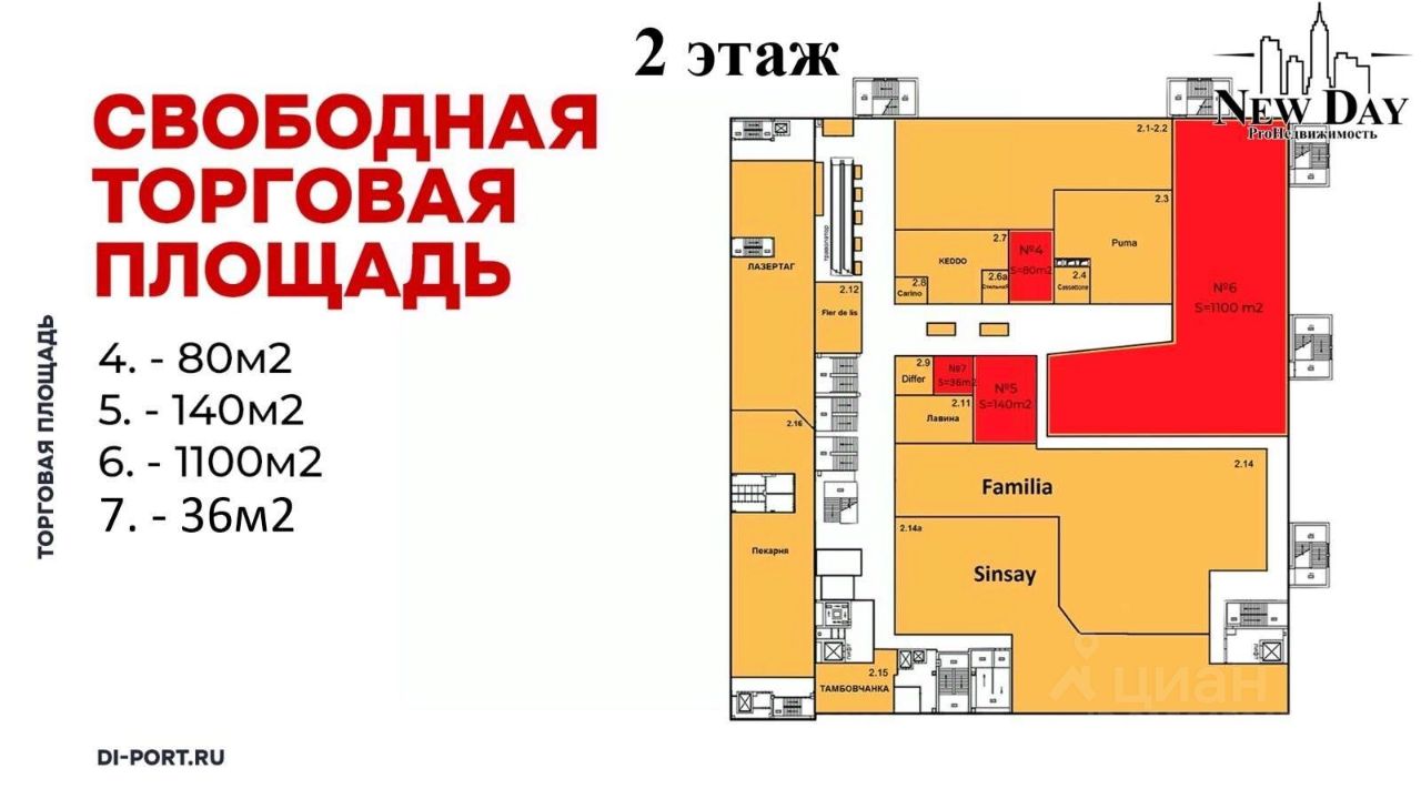 • Адрес: Заводское шоссе, 111 ТЦ Ди-порт. Четырёхэтажное здание. • Общая площадь: 27.000 кв.м. • Предлагаемая площадь в аренду от 36 кв.м. до 1100 кв.м. • Этаж/этажность: 1/4. • Три входа: со стороны основного входа в ТЦ и со стороны Пятёрочки + отдельный вход для разгрузки с улицы • Возможность разгрузки грузовых машин. • Место под рекламу на фасаде помещения ТЦ. • Высота потолков более 3,5м. • Наличие пожарной сигнализации. • Возможность перепланировки. • Выделенная мощность: 100 кВт с возможностью увеличения. • Ремонт в помещении: пол плитка, стены под покраску. • На территории ТЦ: 50 магазинов, 300 машиномест, Проходимость 30.000 человек в неделю, 2 млн. посетителей в год. • Дополнительно есть площади на 1 и 2 этажах