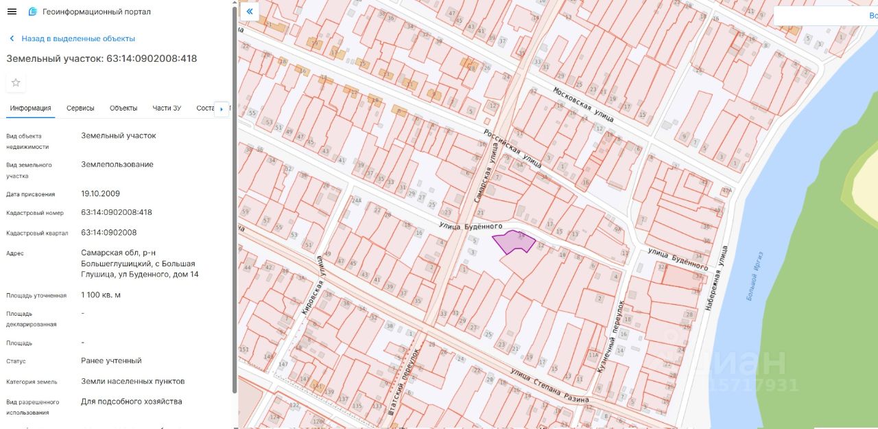 Продается земельный участок в с. Большая Глушица, ул. Буденного, д. 14, площадью 1100 кв.м. (11 соток). Участок широкий угловой. Все коммуникации имеются, асфальт, тихое уютное место! На участке расположен дом с документами (состояние ветхое).