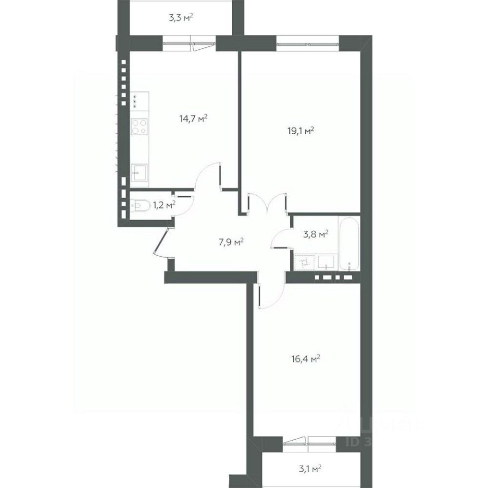 Комнаты изолированные, комфортная планировка: площадь комнат 19,10 и 16,40 кв.м., кухня квадратная 14,70 кв.м., сан узел раздельный, две лоджии: из кухни и из спальной комнаты.