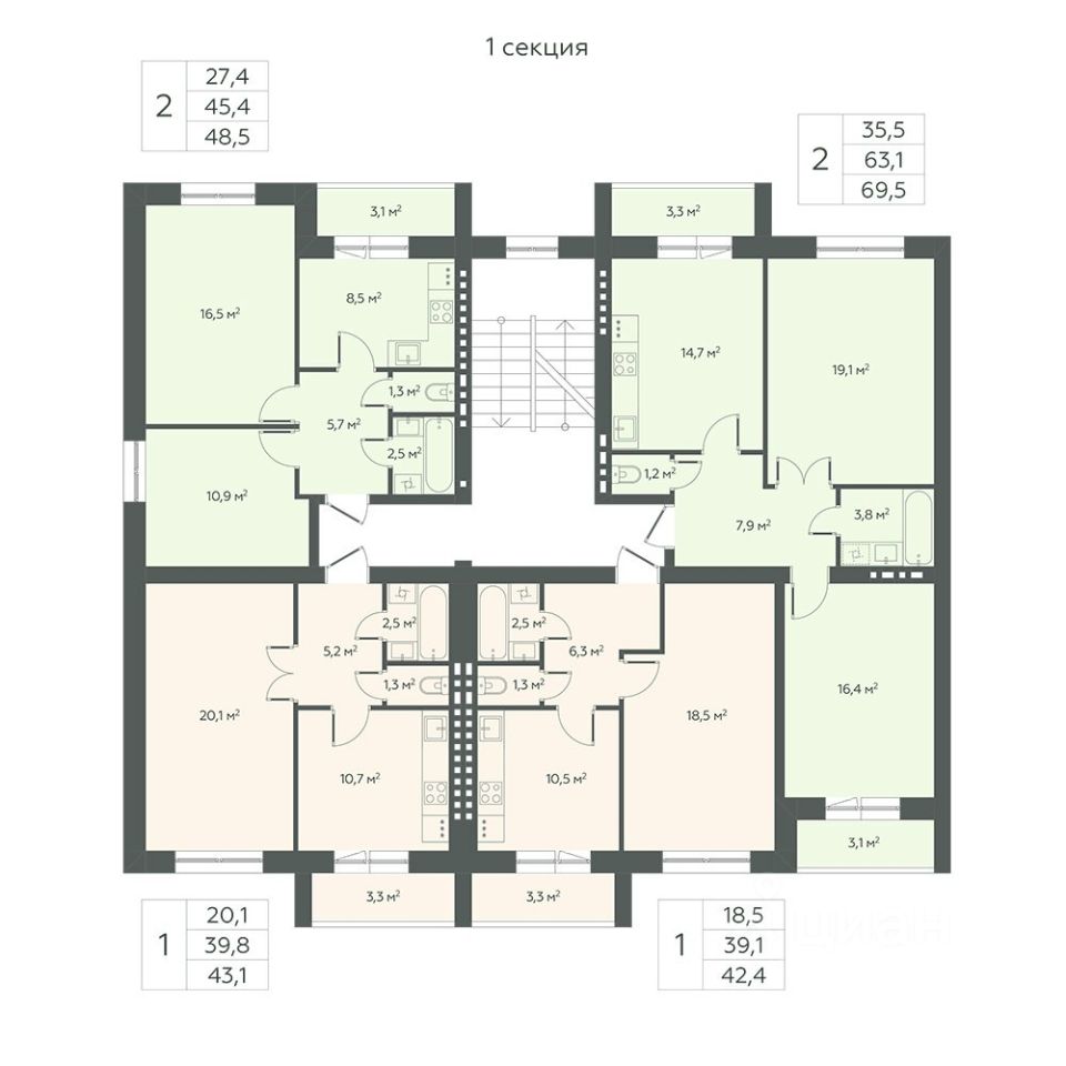 Просторные лестничные пролеты, четыре квартиры на площадке.