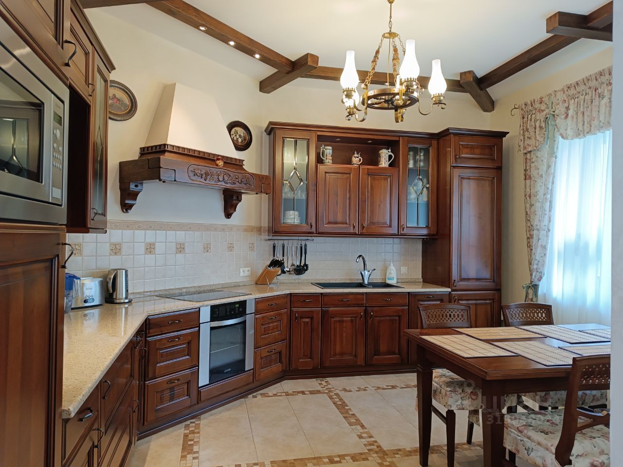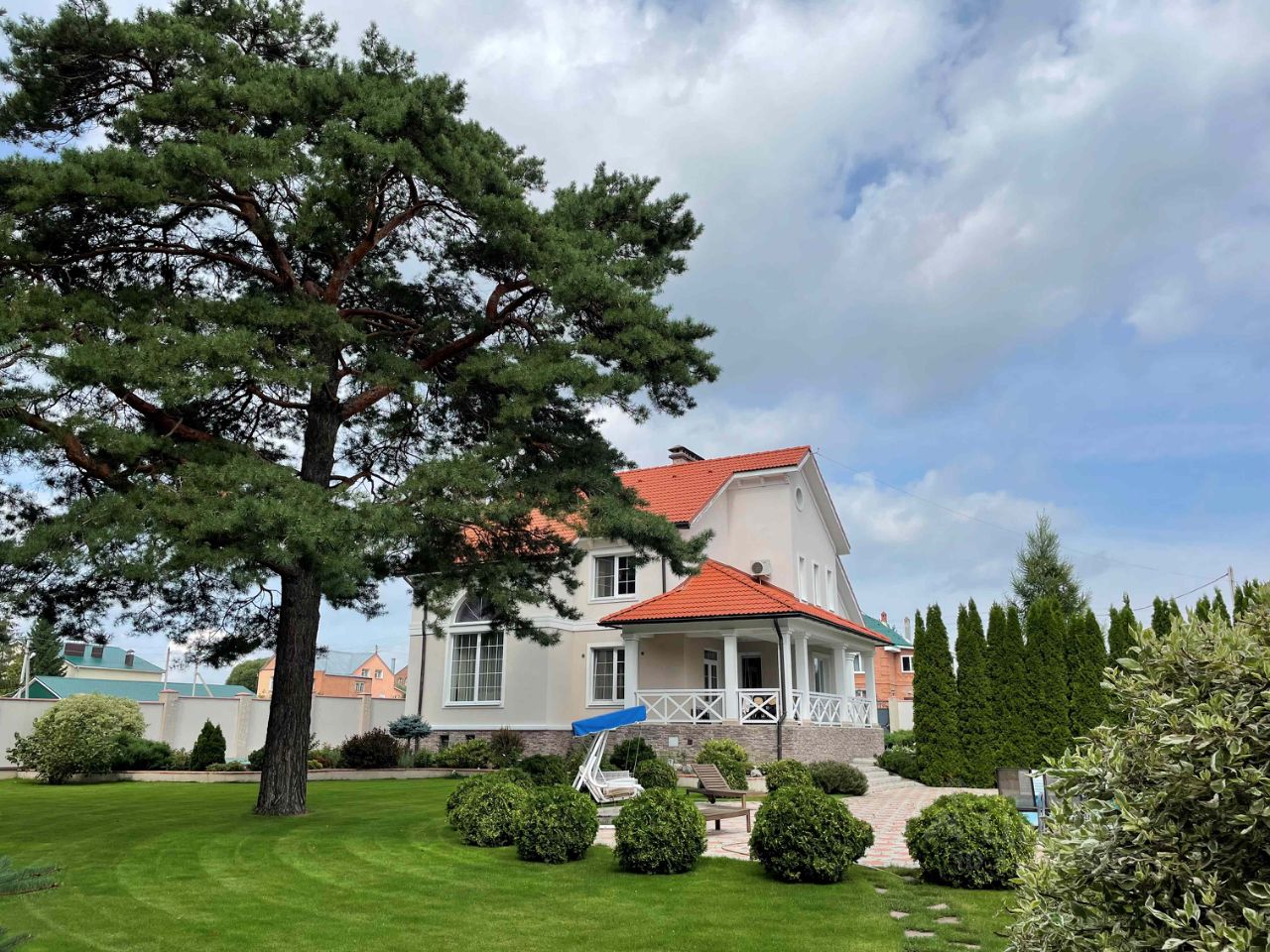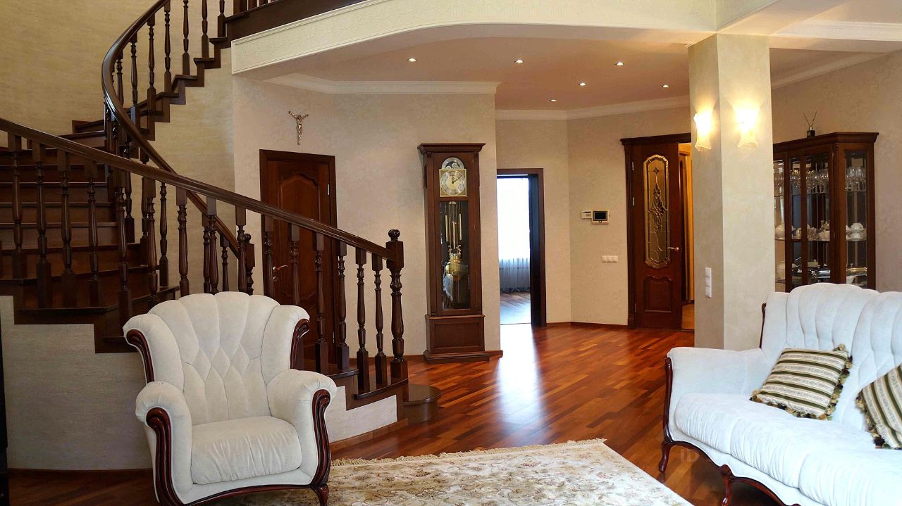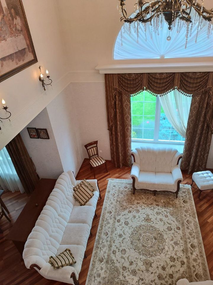 Оригинальный дизайн помещений, выдержанный стиль интерьера, тысяча продуманных мелочей, делающих проживание удобным и безопасным. Есть два гаража, площадка для четырех автомобилей гостей, автоматически закрывающиеся ворота.