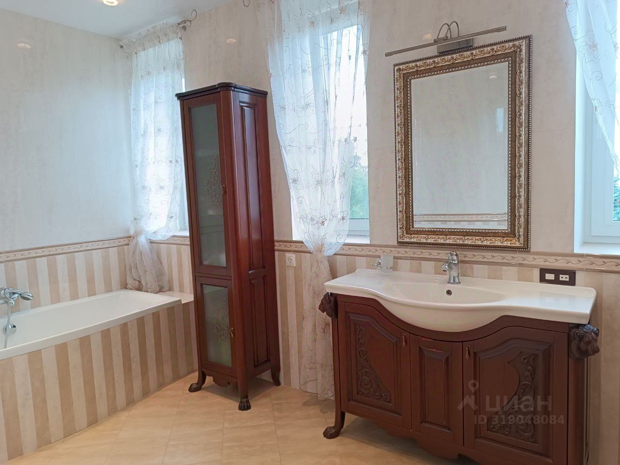 На первом этаже (144 кв.м.) гостиная, столовая, хорошо оборудованная кухня, кабинет и санузел. Украшением гостиной является дровяной камин. Большие окна и высокие потолки (второй свет) создают удивительную атмосферу покоя и безмятежности.