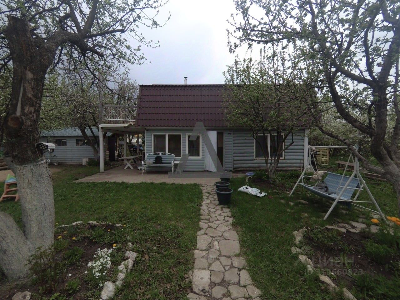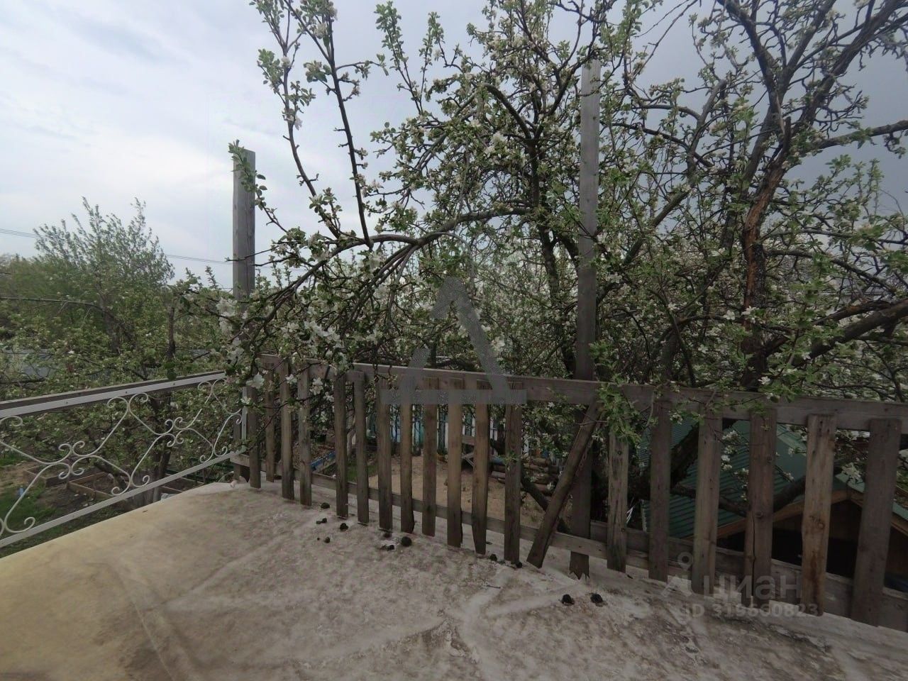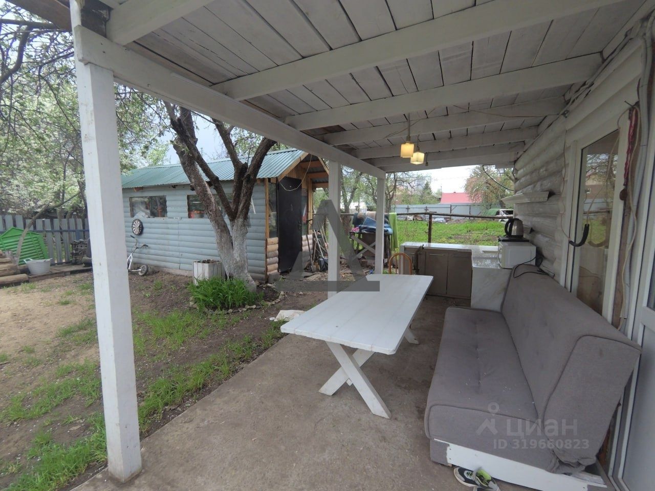 Есть открытая летняя веранда, в саду.