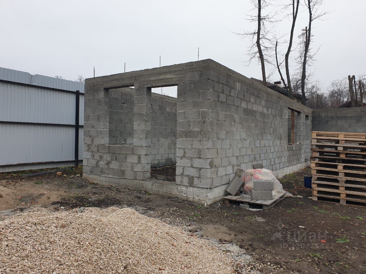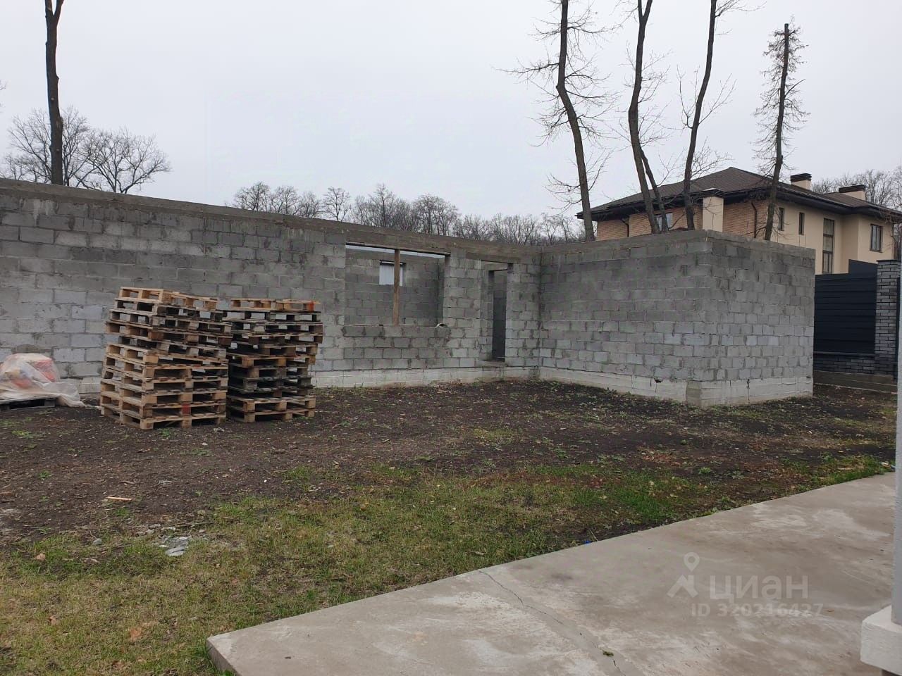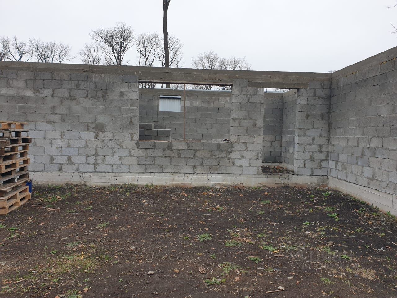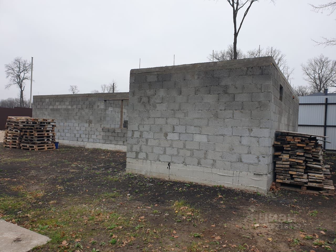 Участок ровный, правильной формы. На участке залит фундамент и выложены стены под банный комплекс с отдельным помещением под хозяйственный блок.