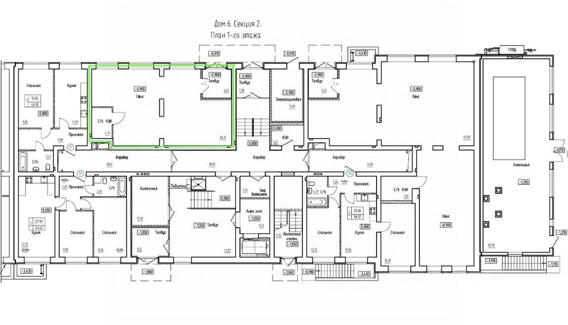 Помещение свободной планировки с отдельным входом с уровня земли. Первый этаж соседнего дома будет полностью занят супермаркетом сети ''Пятерочка''.