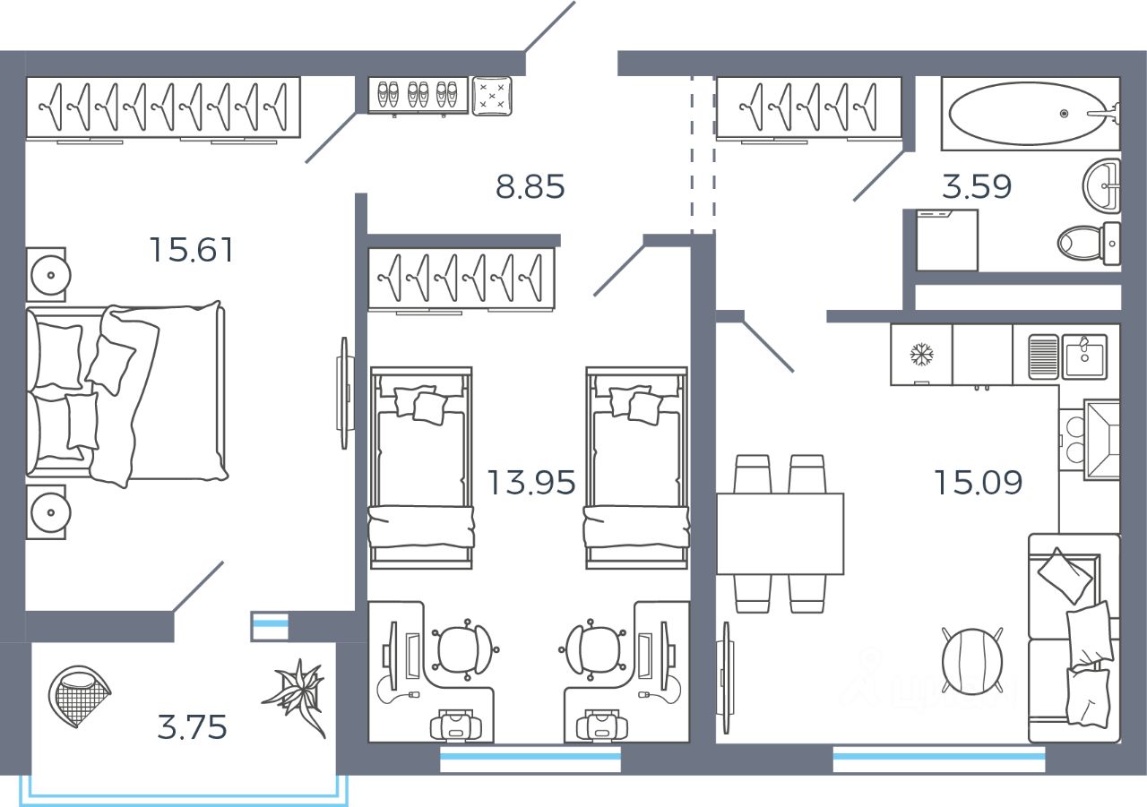 Общая площадь58,97 м2