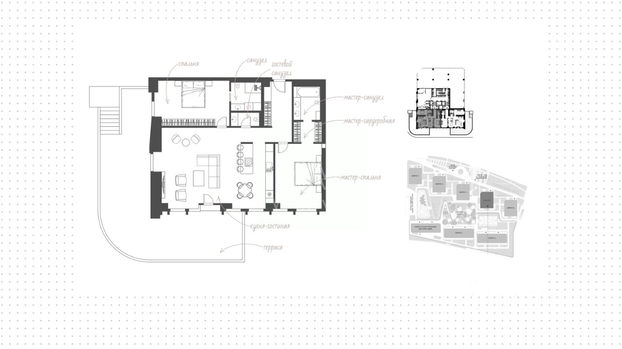 Материалы — темное и светлое дерево, терраццо, декоративная штукатурка, брашированная латунь, розовый оникс Onice Rosa, фурнитура Black Matte Aluminium. Планировка: просторная кухня-гостиная, мастер-спальня с ванной комнатой, вторая спальня с санузлом, гостевой санузел, холл и терраса.