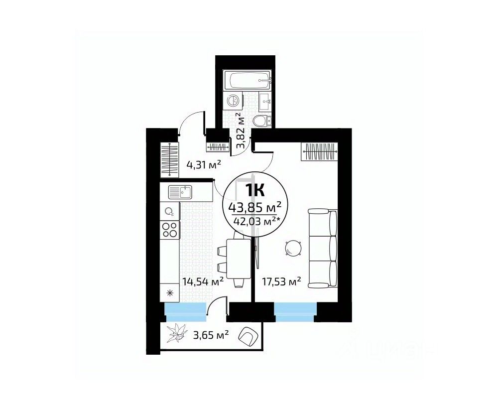 Общая площадь43,85 м2