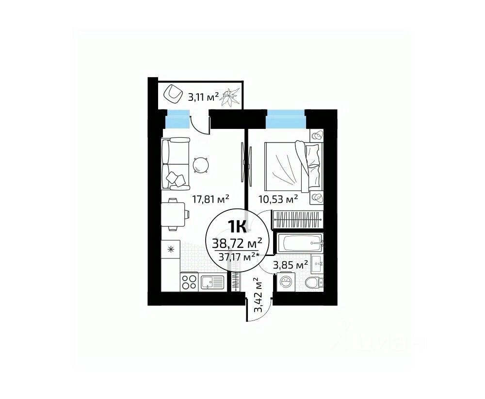 Общая площадь38,72 м2