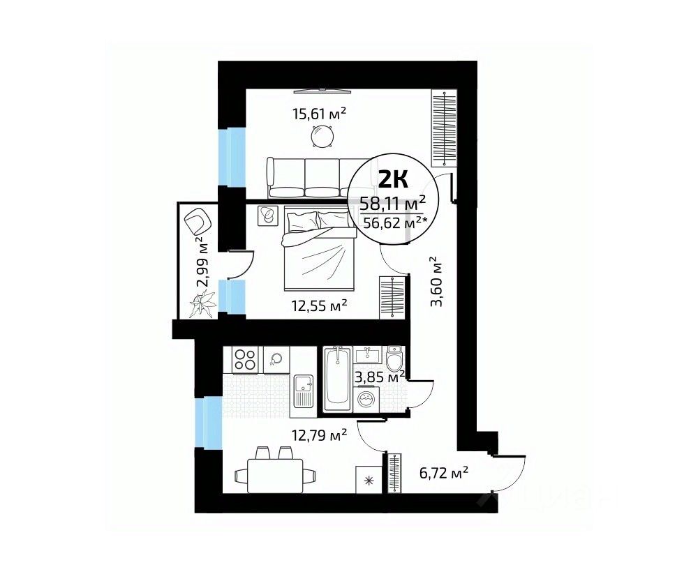 Общая площадь58,11 м2