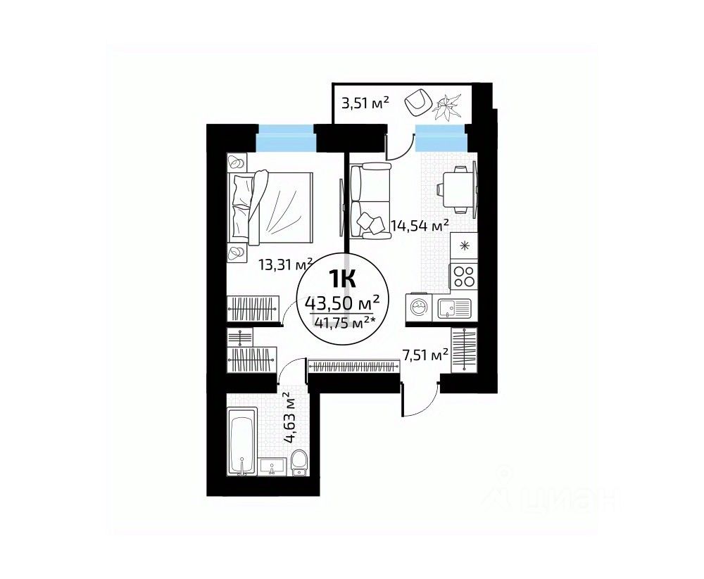 Общая площадь43,5 м2