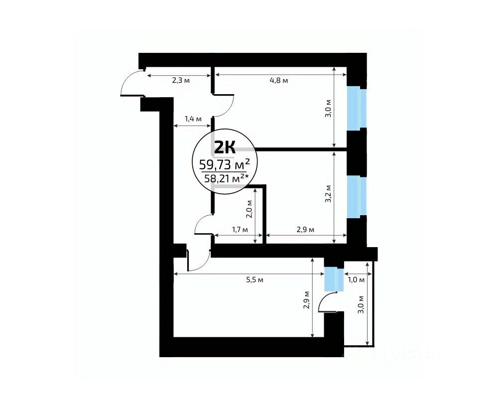 Общая площадь59,73 м2