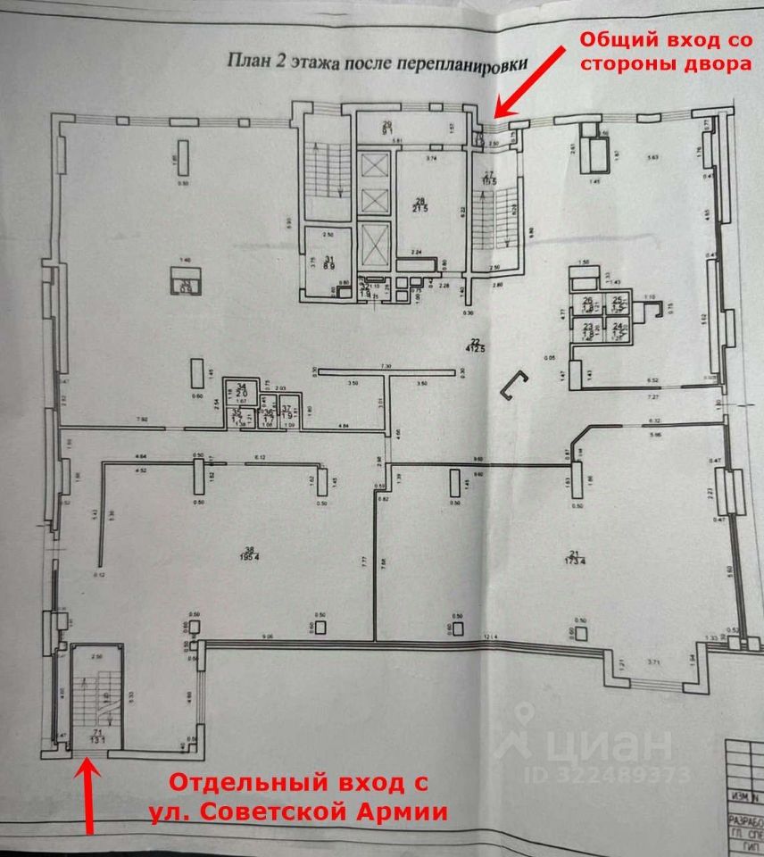 Планировка свободная, с возможностью организации пространства под свои нужды. Высота потолка 3,2 метра, что создает ощущение простора. Выделенная электрическая мощность 75 кВт. Несколько мокрых точек. Естественное освещение создается благодаря большому количеству окон. Два входа: отдельный со стороны ул. Советской Армии и второй общий со стороны двора.