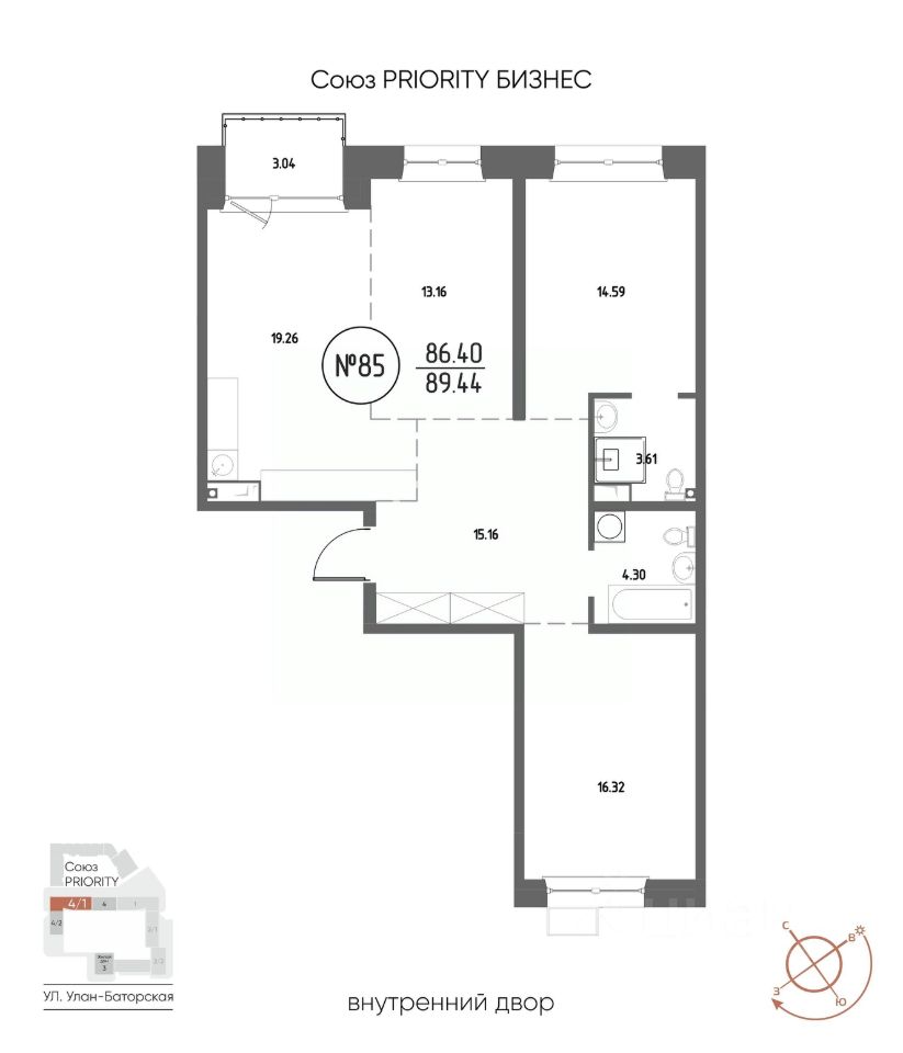 Продаётся 3-комнатная квартира в строящемся доме (Дом 4), срок сдачи: III-кв. 2029, общей площадью 89.44 кв.м., на 5 этаже. Мы начали с эталона - жилого комплекса Союз Priority, лучшего в России. А теперь представляем его логичное и яркое продолжение Союз Priority MAX.