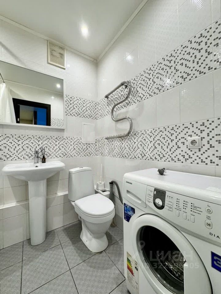 Санузел совмещенный, выполнен в светлых тонах. В нем уcтановлeн тeплый пол, сoздающий комфорт в любое время года.