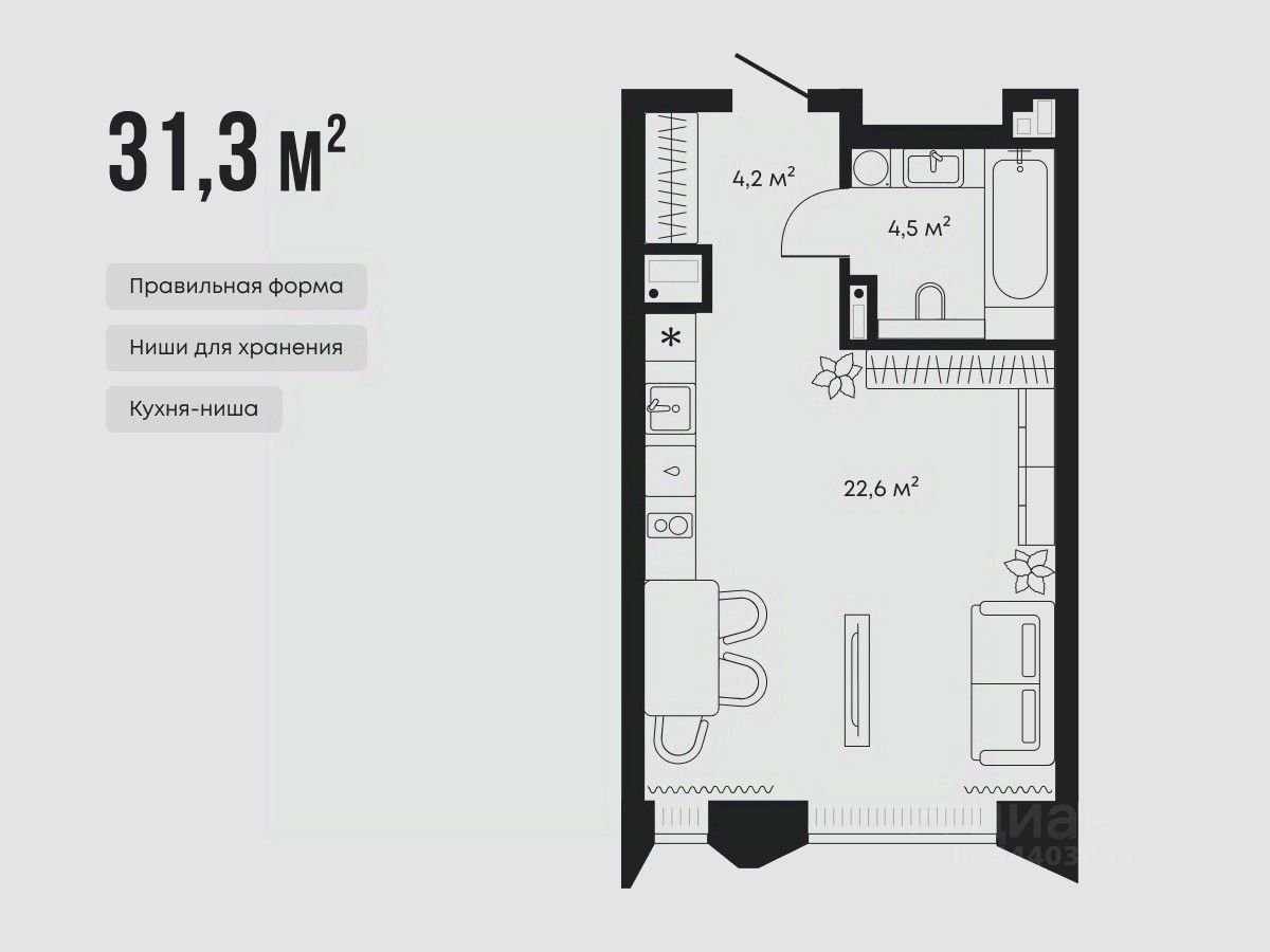 Планировка правильной формы позволяет функционально разделить пространство на зону кухни, обеденную зону, места для отдыха и работы. В комнате и прихожей предусмотрены ниши для организации систем хранения.