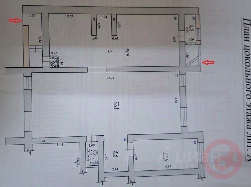 Неглубокий цоколь (всего 4 ступени вниз) с полноценными окнами. Торговый зал 50 кв.м с выходом во двор для погрузки-выгрузки. Второй торговый зал 73,1 кв.м с четырьмя окнами. Кабинет 15,9 кв.м и коридорчик 5,6 квм. Состояние помещения отличное. Высота потолка 2,6 метра.