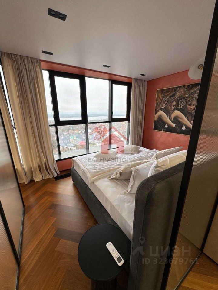 Мастер-спальня с трехпакетными панорамными окнами TTC и видами на Волгу никого не оставит равнодушным. Удобная двуспальная кровать Casaricca Италия ортопедическим матрасом и постельным бельем TOGAS, установлены датчики движения для удобства прохождения в ванную комнату и обратно. Картина, расположенная в спальне, является оригиналом известный художницы Турции.
