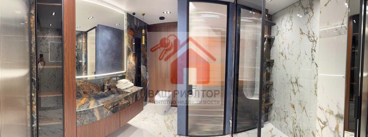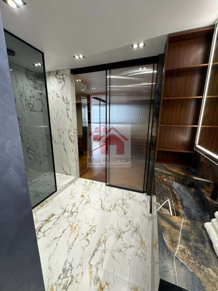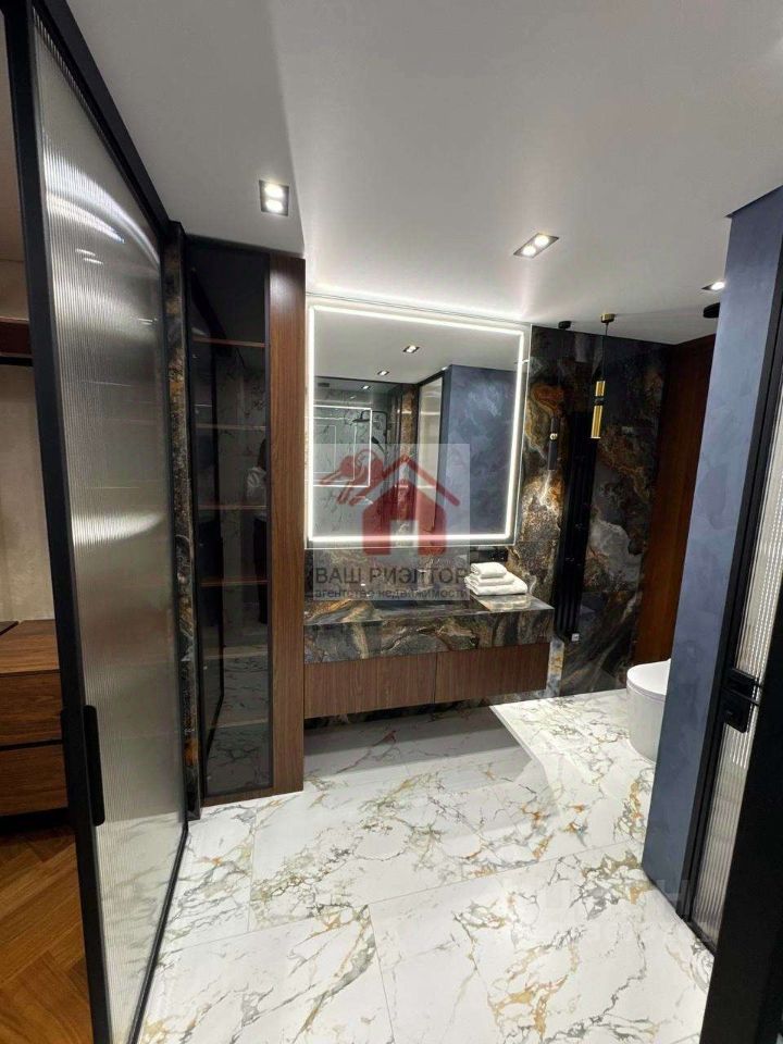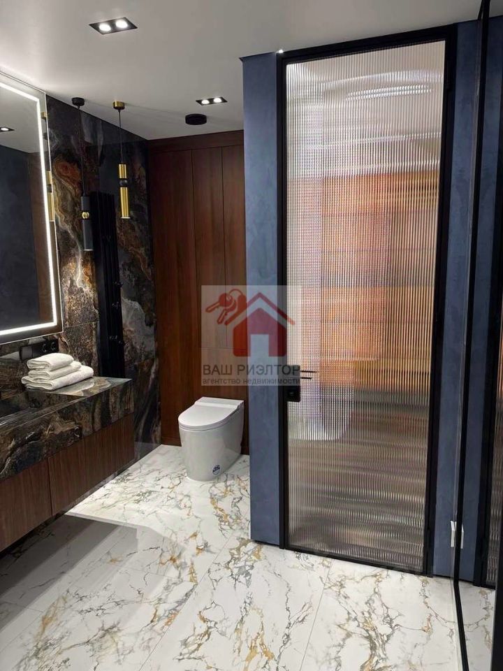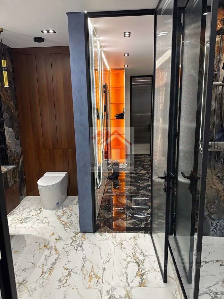 В проекте использовался только итальянский керамогранит, краски производства Бельгия, декоративная штукатурка ARTICA SIGNORIA, немецкая сантехника GROCENBERG, гигиенический унитаз с подсветкой и подогревом - автоматически смывает и омывает унитаз, в ванных комнатах установленный тёплый пол, который также подключаются к Wi-Fi системе, стиральная машинка на 7 кг плюс сушильная машинка, над ней шкаф с выдвижной системы для сушки и хранения белья, все отопительные приборы оснащены терморегуляторами. В квартире установлены приборы учёта индивидуального употребления на отопление