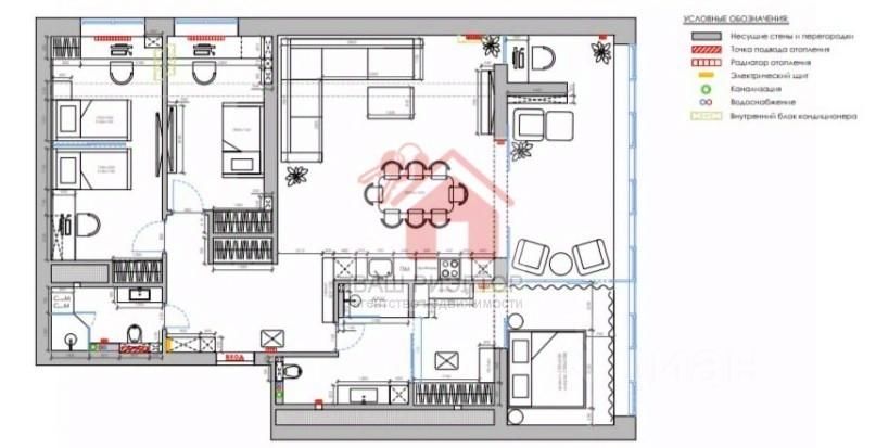 По всей квартире расположены отопительные приборы итальянского производства вертикального расположения, сплит-системы CENTEK с возможностью подключения к Wi-Fi.