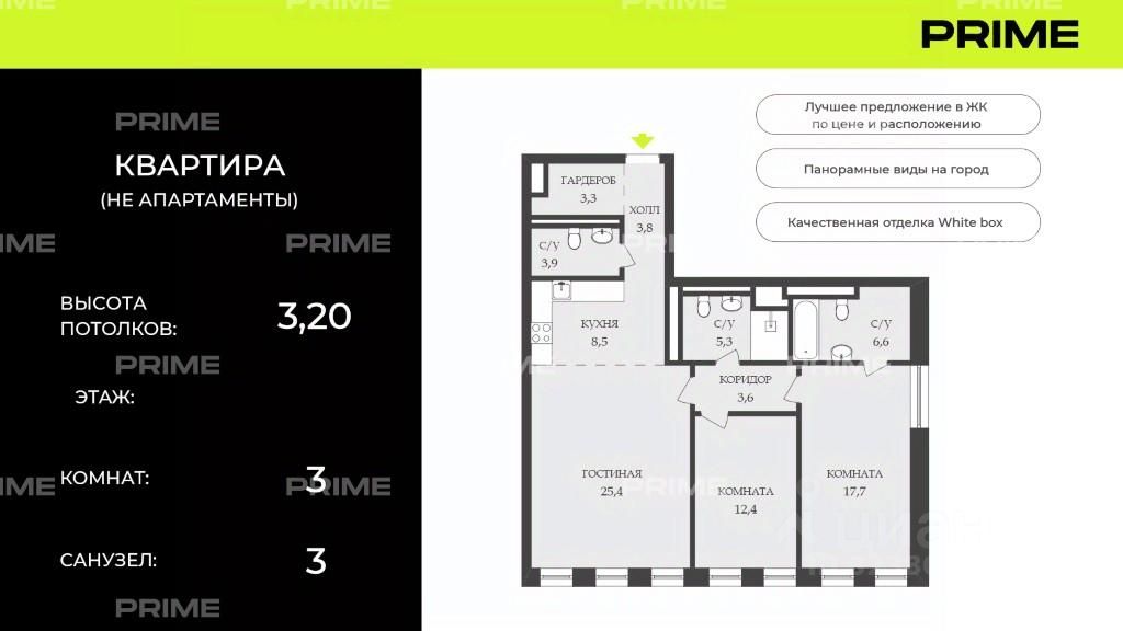 Преимущества квартиры: • Квартира расположена в модуле А, 6 этаж из 17 — оптимальная высота для открытых, панорамных видов и приватности. • Панорамные окна в пол, виды на Москву и много естественного света. • В квартире выполнен качественный white box — идеально ровные стены, стяжка пола, выполнена разводка коммуникаций и электрики. • Высота потолков — 3,1 м. • Продуманная планировка: просторная кухня-гостиная (30м2), две изолированные спальни, три санузла, две ванные комнаты, гардеробная и просторный холл, настолько продуманные планировки встречаются довольно редко. • Возможность реализовать индивидуальный дизайн-проект без строительного шума и пыли.