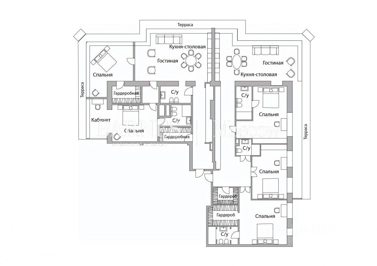 Апартамент без отделки с возможностью разместить: просторную гостиную с зонами столовой и кухни, 5-6 спален, 5 санузлов, гардеробные, постирочную и дополнительные хозяйственные помещения. Терраса по периметру апартамента.