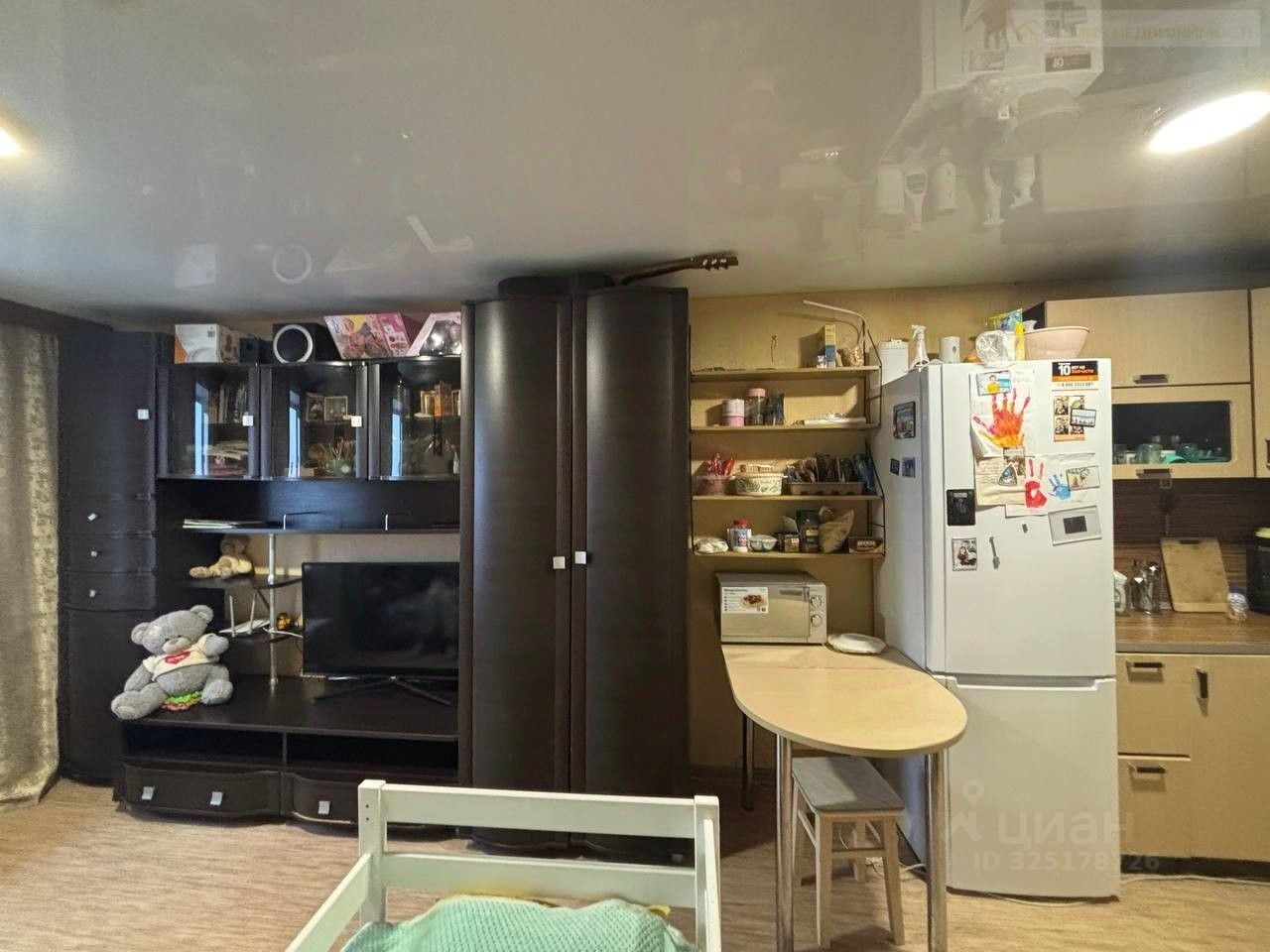 В комнате оборудована кухонная зона, зона прихожей. Оставляем: стенку-горку, кухонный гарнитур, сплит-систему, мебель в зоне прихожей (шкаф, вешалка настенная, обувница), стол кухонный, стулья, шторы, осветительные приборы. Одним словом заезжай и живи.
