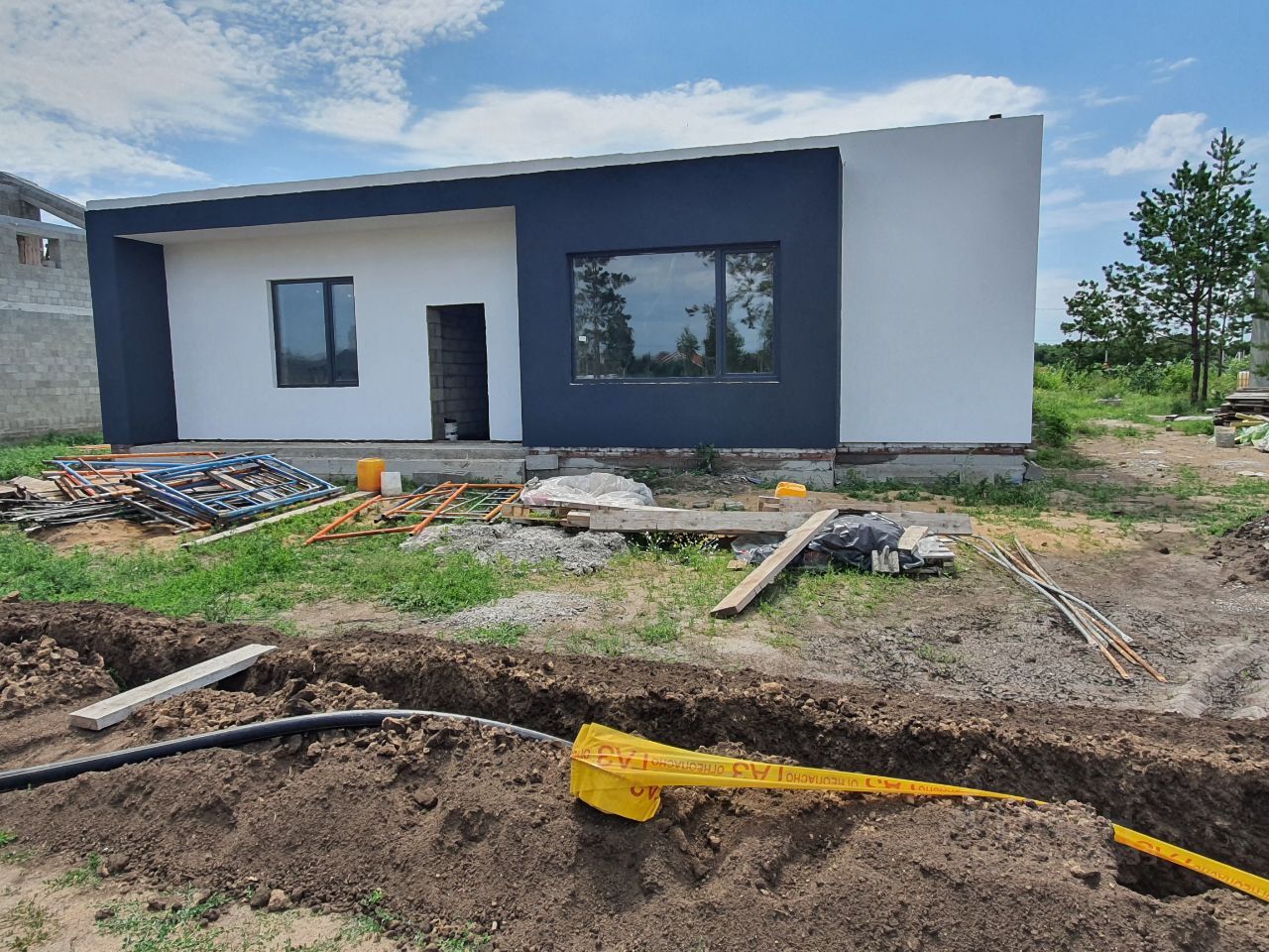 Начало строительства апрель 2023.Проектно-сметная,расчетная,дизайнерская документация выполнена в полном объеме. Фундамент свайно-ростверковый глубина свай 2,5м. Расчетное сечение ростверка 0.6*0 4м. Арматура ф12. Выполнена обратная засыпка суглинком что даёт дополнительную гидроизоляцию основных элементов фундамента. При бетонировании плиты использовалась арматура ф10 с сечением 0.4*0.4м Стены выполнены из керамзито -бетонного блока, наполнение керамзита 50% толщина 0.4м(в блок). Стены утеплены каменной ватой толщиной 50мм. Фасад декоративная штукатурка. Отдельные элементы фасада выполнены из плитки камня и дерева. Перекрытия выполнены из пустотных железобетонных плит. Кровля утепление 200мм и два слоя кровельного материала с наружным водостоком.