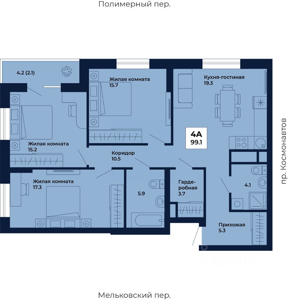 Продаётся 3-комнатная квартира в строящемся доме (Дом 8,9), срок сдачи: I-кв. 2029, общей площадью 99.1 кв.м., на 4 этаже. ЖК ''Космос'' - современный жилой квартал на проспекте Космонавтов 7, который строит ГК ''Ривьера Инвест Екатеринбург''. Жилой комплекс - это пять домов, благоустроенная территория комплекса и наземная парковка. Места общего пользования также выполнены в единой стилистике ''космической'' темы, используемой и в оформлении холлов, и дворов.