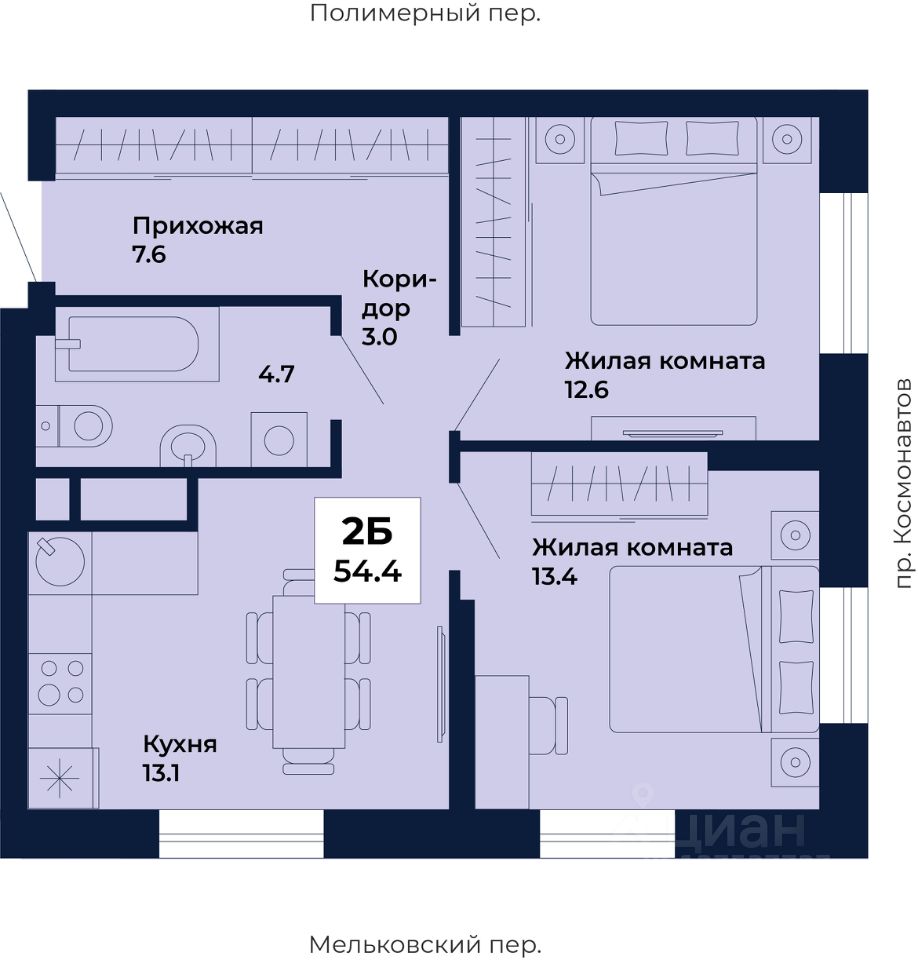 Продаётся 2-комнатная квартира в строящемся доме (Дом 8,9), срок сдачи: I-кв. 2029, общей площадью 54.4 кв.м., на 14 этаже. ЖК ''Космос'' - современный жилой квартал на проспекте Космонавтов 7, который строит ГК ''Ривьера Инвест Екатеринбург''. Жилой комплекс - это пять домов, благоустроенная территория комплекса и наземная парковка. Места общего пользования также выполнены в единой стилистике ''космической'' темы, используемой и в оформлении холлов, и дворов.