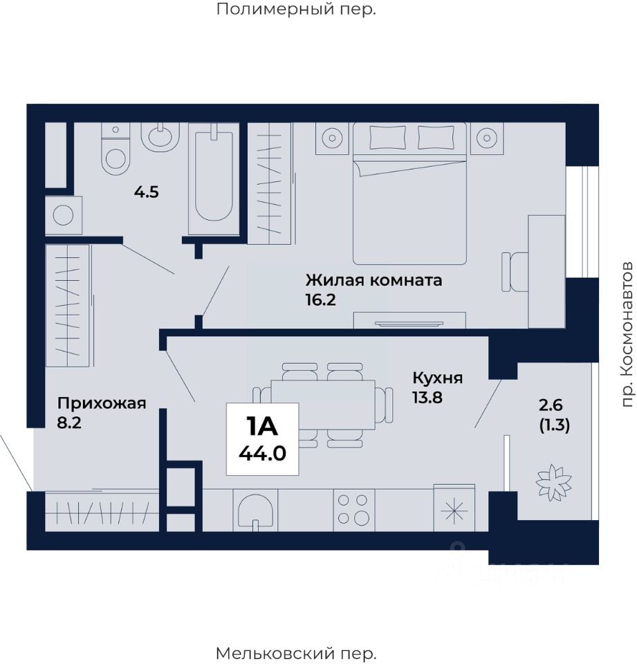 Продаётся 1-комнатная квартира в строящемся доме (Дом 8,9), срок сдачи: I-кв. 2029, общей площадью 44 кв.м., на 13 этаже. ЖК ''Космос'' - современный жилой квартал на проспекте Космонавтов 7, который строит ГК ''Ривьера Инвест Екатеринбург''. Жилой комплекс - это пять домов, благоустроенная территория комплекса и наземная парковка. Места общего пользования также выполнены в единой стилистике ''космической'' темы, используемой и в оформлении холлов, и дворов.