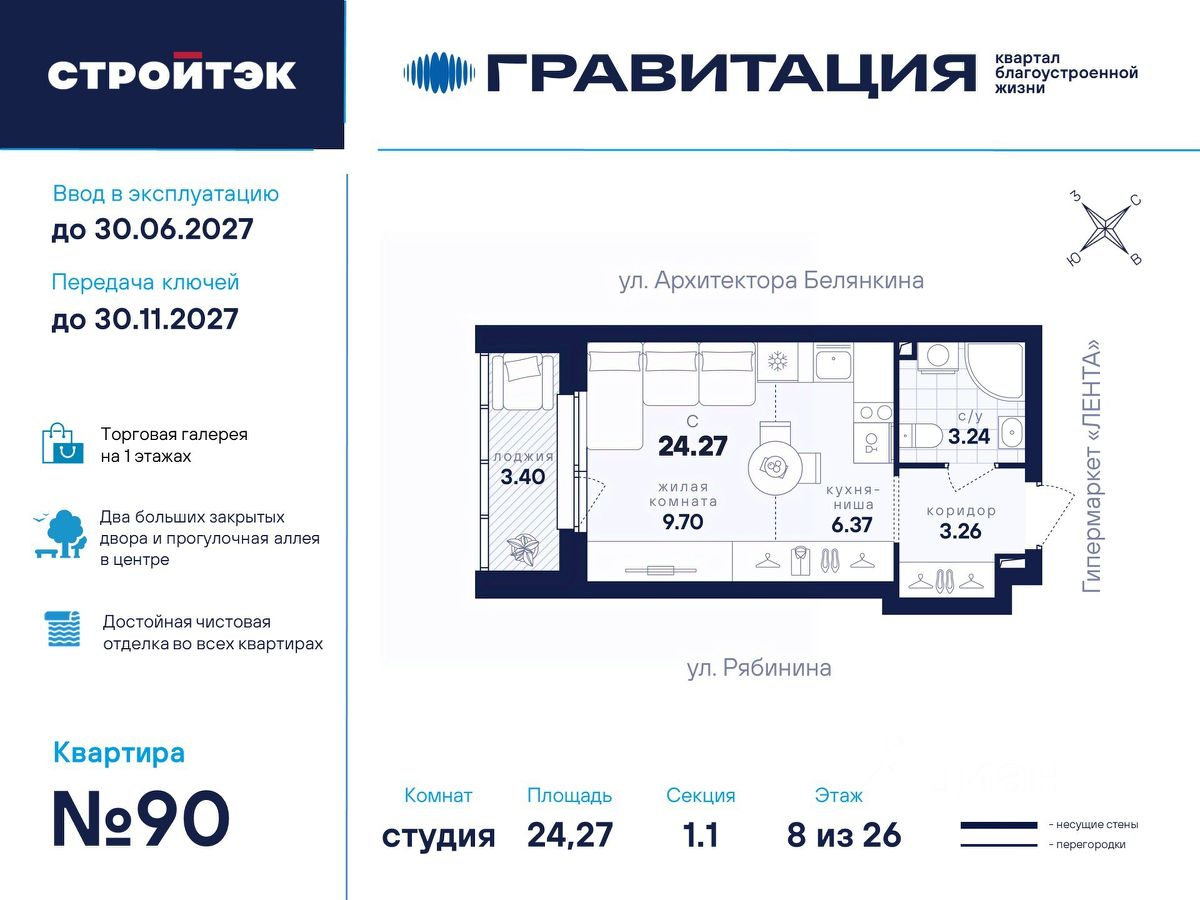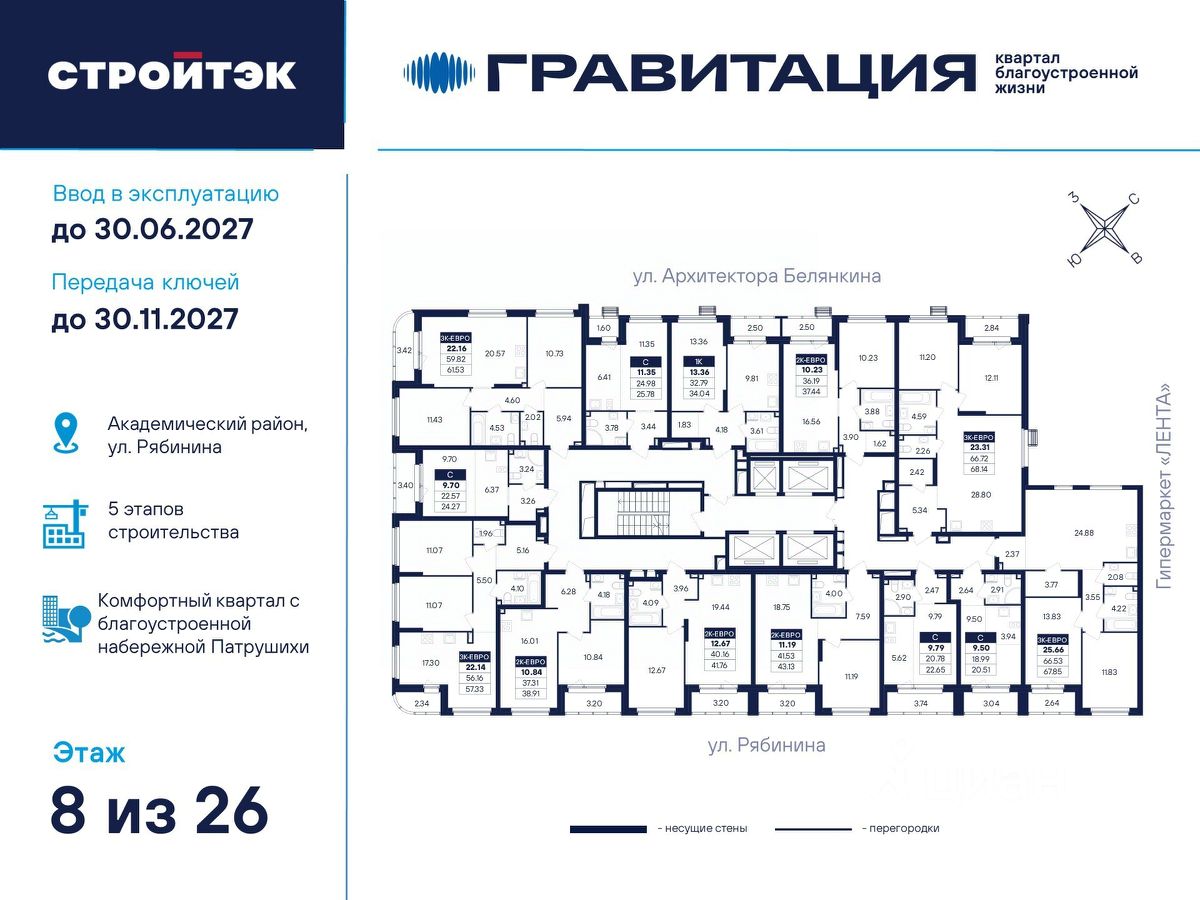 Удачные решения Новый квартал благоустроенной жизни ''Гравитация'' мы разместили в периметре улиц Рябинина и Академика Ландау. У квартала 5 этапов строительства, а всю работу мы завершим к 2030 году. Авторы проекта гармонично совместили в оформлении природные элементы и современный дизайн. Волнообразные очертания на стенах вдохновлены силой ветра и движением воды. Скруглённые углы подчеркивают элегантный силуэт, а контрастная палитра акцентов и контурная подсветка верхних этажей создают выразительный архитектурный образ. Первый этап строительства: — Секция 1.1 — 1 подъезд 26 этажей — Секция 1.2 — 2 подъезда 16 этажей — Секция 1.3 — 1 подъезд 12 этажей Здесь всё и сразу Гравитация — уютный и обособленный, и в то же время открытый и просторный квартал. Всё рядом: супермаркеты и парки, кино и рестораны, школы и сады. В нескольких шагах набережная реки Патрушихи. В квартале построят муниципальный детский сад на 200 мест, а на 5 этапе строительства мы возведём 6-уровневый надземный паркинг на 250 машин. На первых этажах домов для вас будет работать торговая галерея с магазинами, кафе и привычными бытовыми сервисами. В 1 этапе строительства 631 квартира. Своя вселенная Развитый Академический район удобен и молодым семьям, и школьникам, и состоявшимся профессионалам. Рядом большой Преображенский парк с озером и Юго-Западный лесопарк с Тропой здоровья. — 3 минуты до Гипер Ленты — 10 минут на машине до ТРЦ ''Академический'', 15 минут до ЕКАД, 25 до центра — 6 школ и 6 детских садов — Спортивные комплексы и клубы Wake up, Bright Fit и Юность Богатые возможности В квартале два просторных закрытых двора общей площадью 1,4 гектара. Один двор объединяет 1 и 2 этапы строительства, другой — 3, 4 и 5 этапы. Между дворами — камерная прогулочная аллея для неспешных вечеров или полуденного отдыха. Во дворе первого этапа — зелёные участки из хвойных деревьев, акцентных кустарников и травянистых многолетников, а также сеть дорожек, детская площадка с песочницей, аттракционами и геопластикой, настольный теннис и зона для зарядки. А для комфорта и безопасности — вечернее освещение, охрана и постоянное видеонаблюдение. Пространство с заботой В просторных светлых лобби Гравитации — интеллигентный дизайн, помещения для колясок, высокие витражи и комфортная мебель. Выходы сквозные, на улицу и во двор. Лифты грузоподъёмностью 1000 и 450 кг. Мы подготовили для вас 44 уникальных варианта продуманных планировок, в том числе с кухнями-гостиными, гардеробными и мастер-спальнями. Здесь нет бесполезных зон, зато есть где посидеть в семейном кругу и разместить всё для удобства и комфорта. Современные технологии Мы позаботились о достойной чистовой отделке, чтобы вы могли уделить время главному. — Виниловые обои на флизелиновой основе, окрашенные стены в санузлах и на лоджиях — Натяжные потолки везде, кроме лоджий, там — окрашенные — Прочный влагостойкий ламинат и керамическая плитка — Межкомнатные двери светлых тонов и сейф-дверь на входе — Эргономичное размещение розеток и выключателей