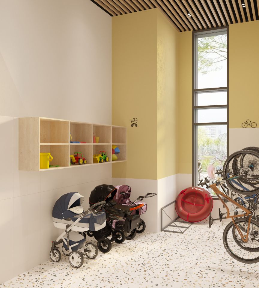 На территории квартала планируется: видеонаблюдение 24/7, подземный паркинг с доступом на лифте, кладовые, велодорожки, многоуровневое озеленение, workout зоны для уличного фитнеса, детские игровые комплексы.