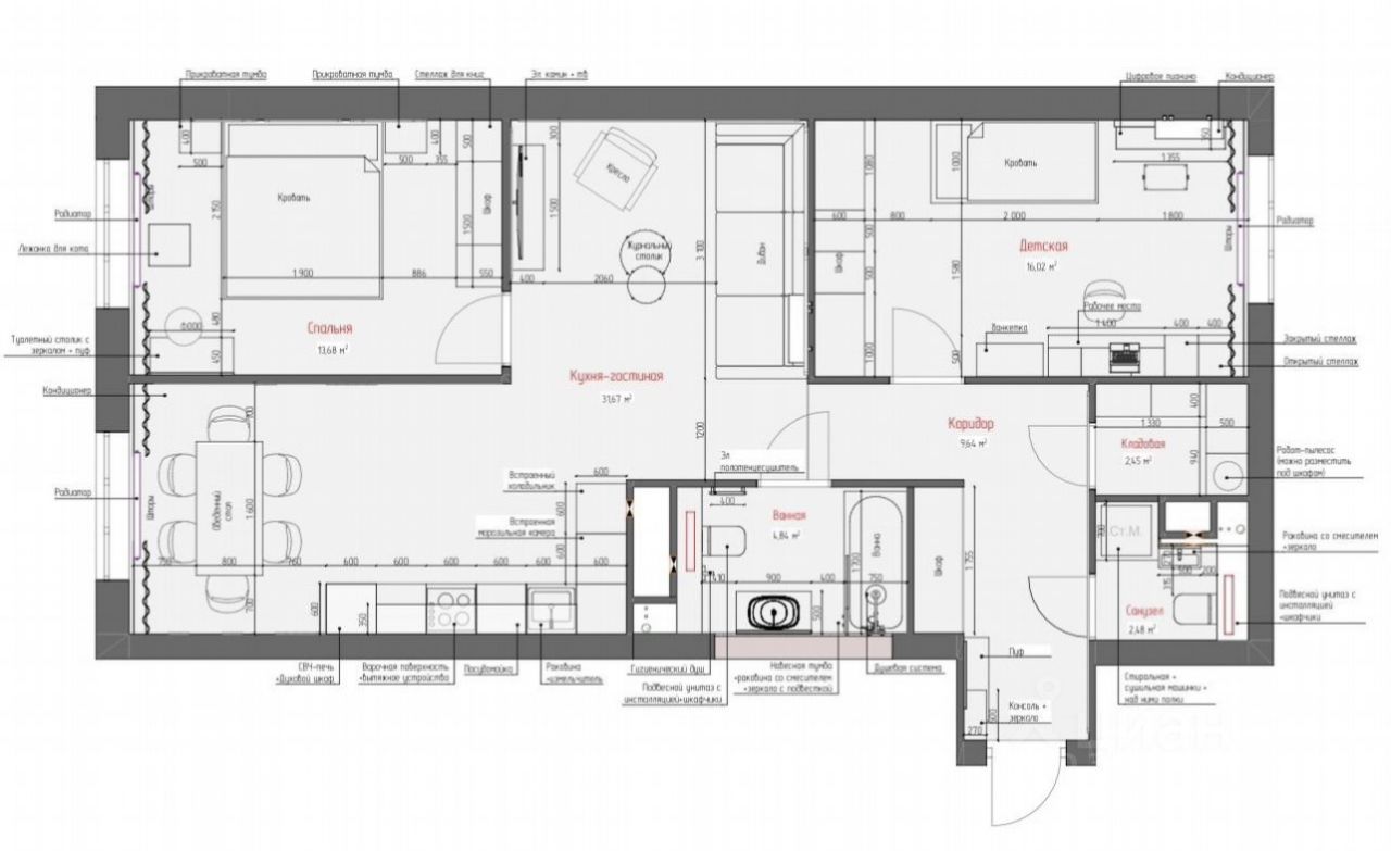 В квартире выполнен качественный, стильный ремонт. 2 санузла Кладовая комната Дополнительная шумоизоляция Теплый пол Двери высотой 2,30 Техника фирмы Bosch, Kupersberg.