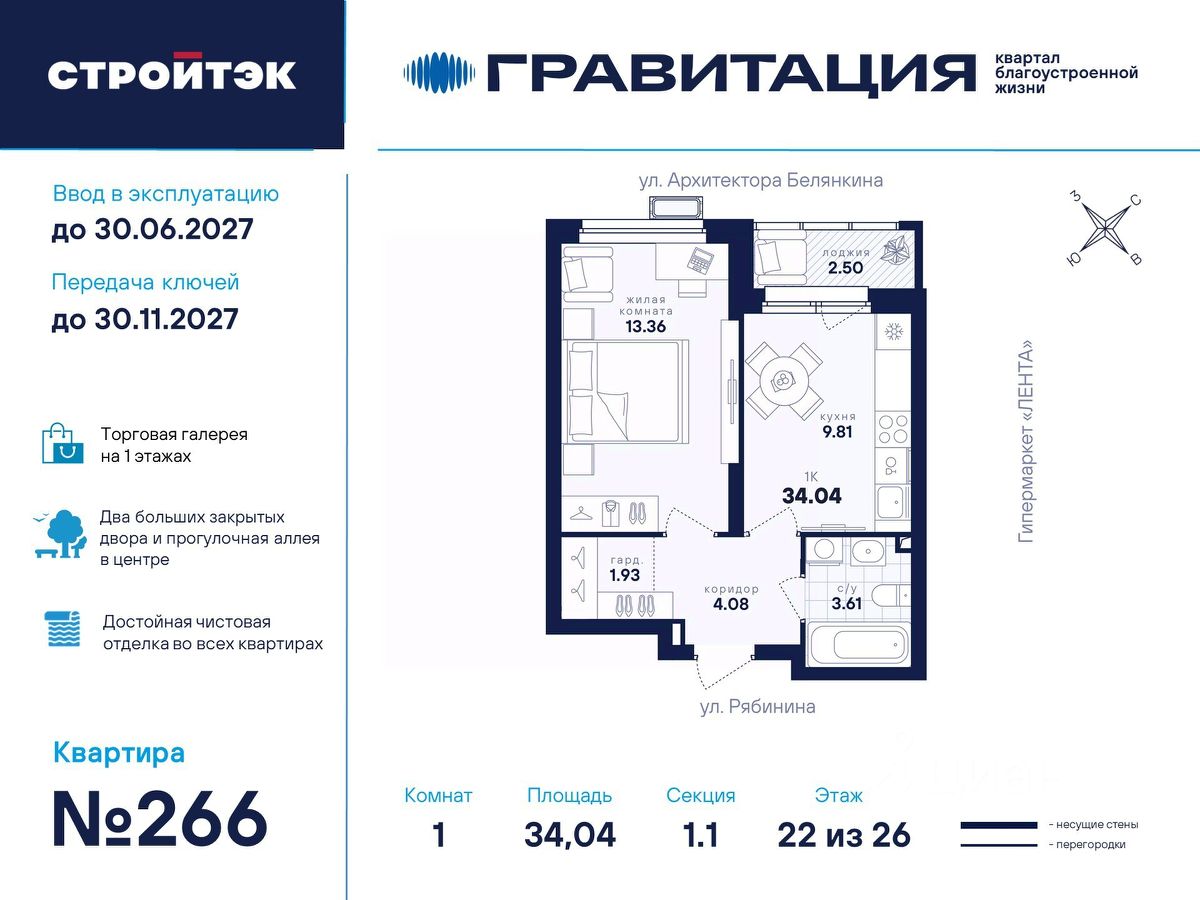 Удачные решения Новый квартал благоустроенной жизни ''Гравитация'' мы разместили в периметре улиц Рябинина и Академика Ландау. У квартала 5 этапов строительства, а всю работу мы завершим к 2030 году. Авторы проекта гармонично совместили в оформлении природные элементы и современный дизайн. Волнообразные очертания на стенах вдохновлены силой ветра и движением воды. Скруглённые углы подчеркивают элегантный силуэт, а контрастная палитра акцентов и контурная подсветка верхних этажей создают выразительный архитектурный образ. Первый этап строительства: — Секция 1.1 — 1 подъезд 26 этажей — Секция 1.2 — 2 подъезда 16 этажей — Секция 1.3 — 1 подъезд 12 этажей Здесь всё и сразу Гравитация — уютный и обособленный, и в то же время открытый и просторный квартал. Всё рядом: супермаркеты и парки, кино и рестораны, школы и сады. В нескольких шагах набережная реки Патрушихи. В квартале построят муниципальный детский сад на 200 мест, а на 5 этапе строительства мы возведём 6-уровневый надземный паркинг на 250 машин. На первых этажах домов для вас будет работать торговая галерея с магазинами, кафе и привычными бытовыми сервисами. В 1 этапе строительства 631 квартира. Своя вселенная Развитый Академический район удобен и молодым семьям, и школьникам, и состоявшимся профессионалам. Рядом большой Преображенский парк с озером и Юго-Западный лесопарк с Тропой здоровья. — 3 минуты до Гипер Ленты — 10 минут на машине до ТРЦ ''Академический'', 15 минут до ЕКАД, 25 до центра — 6 школ и 6 детских садов — Спортивные комплексы и клубы Wake up, Bright Fit и Юность Богатые возможности В квартале два просторных закрытых двора общей площадью 1,4 гектара. Один двор объединяет 1 и 2 этапы строительства, другой — 3, 4 и 5 этапы. Между дворами — камерная прогулочная аллея для неспешных вечеров или полуденного отдыха. Во дворе первого этапа — зелёные участки из хвойных деревьев, акцентных кустарников и травянистых многолетников, а также сеть дорожек, детская площадка с песочницей, аттракционами и геопластикой, настольный теннис и зона для зарядки. А для комфорта и безопасности — вечернее освещение, охрана и постоянное видеонаблюдение. Пространство с заботой В просторных светлых лобби Гравитации — интеллигентный дизайн, помещения для колясок, высокие витражи и комфортная мебель. Выходы сквозные, на улицу и во двор. Лифты грузоподъёмностью 1000 и 450 кг. Мы подготовили для вас 44 уникальных варианта продуманных планировок, в том числе с кухнями-гостиными, гардеробными и мастер-спальнями. Здесь нет бесполезных зон, зато есть где посидеть в семейном кругу и разместить всё для удобства и комфорта. Современные технологии Мы позаботились о достойной чистовой отделке, чтобы вы могли уделить время главному. — Виниловые обои на флизелиновой основе, окрашенные стены в санузлах и на лоджиях — Натяжные потолки везде, кроме лоджий, там — окрашенные — Прочный влагостойкий ламинат и керамическая плитка — Межкомнатные двери светлых тонов и сейф-дверь на входе — Эргономичное размещение розеток и выключателей
