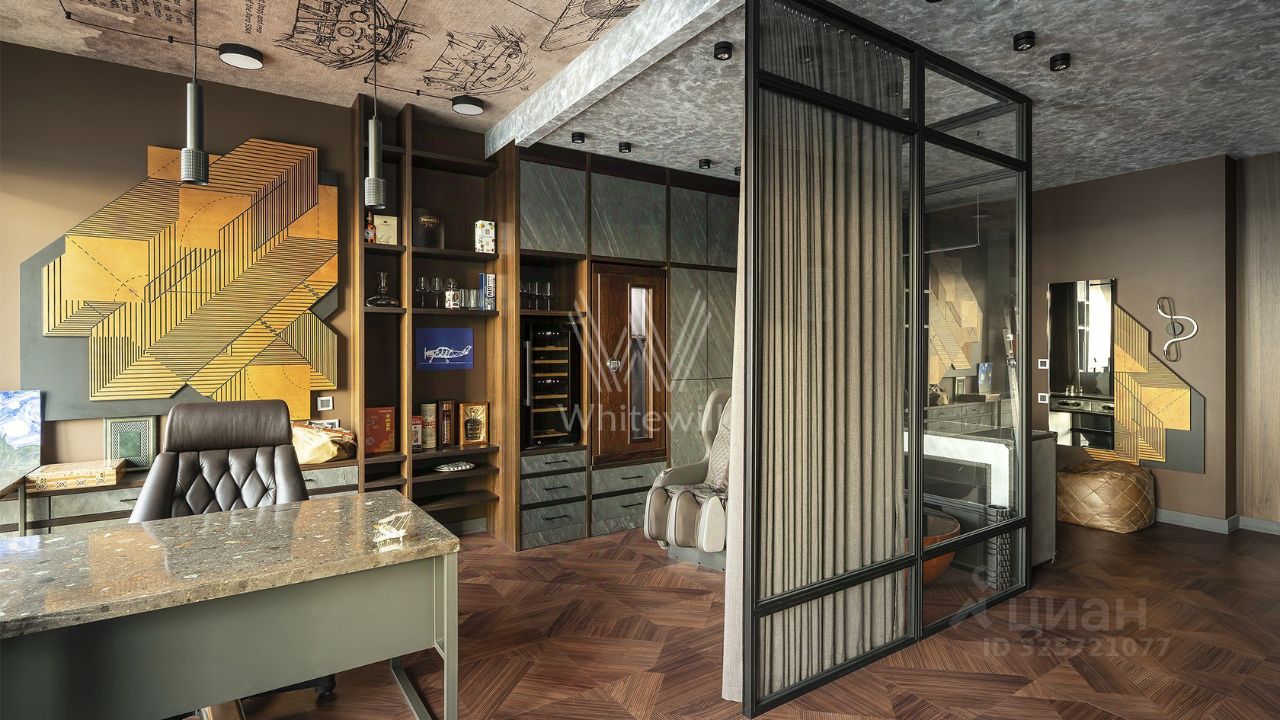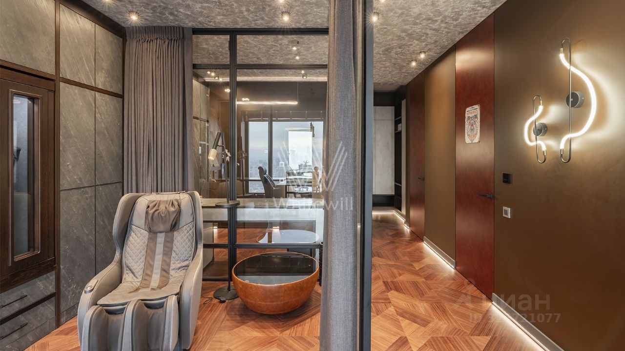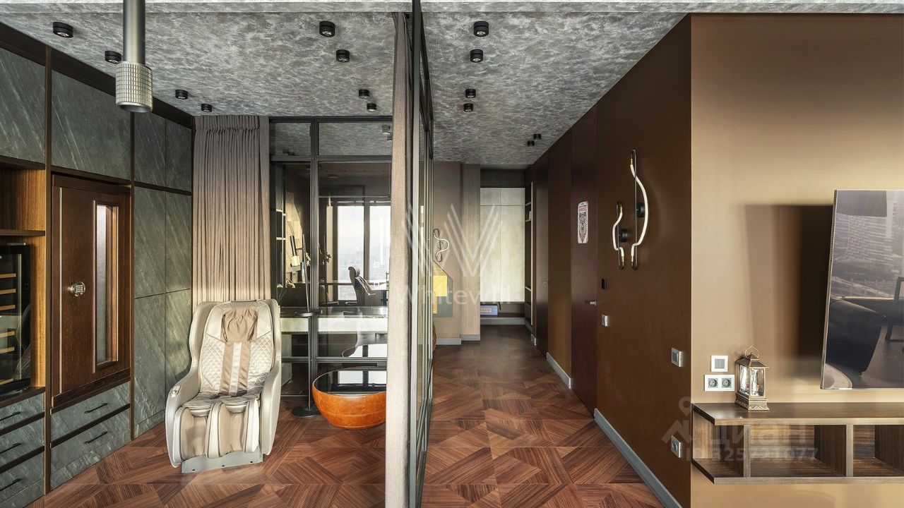 Квартира полностью меблирована и укомплектована бытовой техникой. Функциональная планировка включает кухню-гостиную с обеденной и ТВ зонами, спальню, кабинет, который можно оборудовать как вторую спальню, ванную комнату, гардеробную и холл. Благодаря панорамным окнам, ориентированным на две стороны, пространство наполнено естественным светом и теплом.