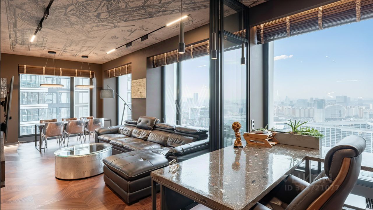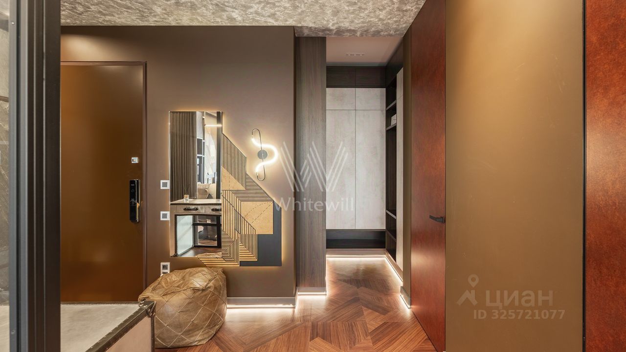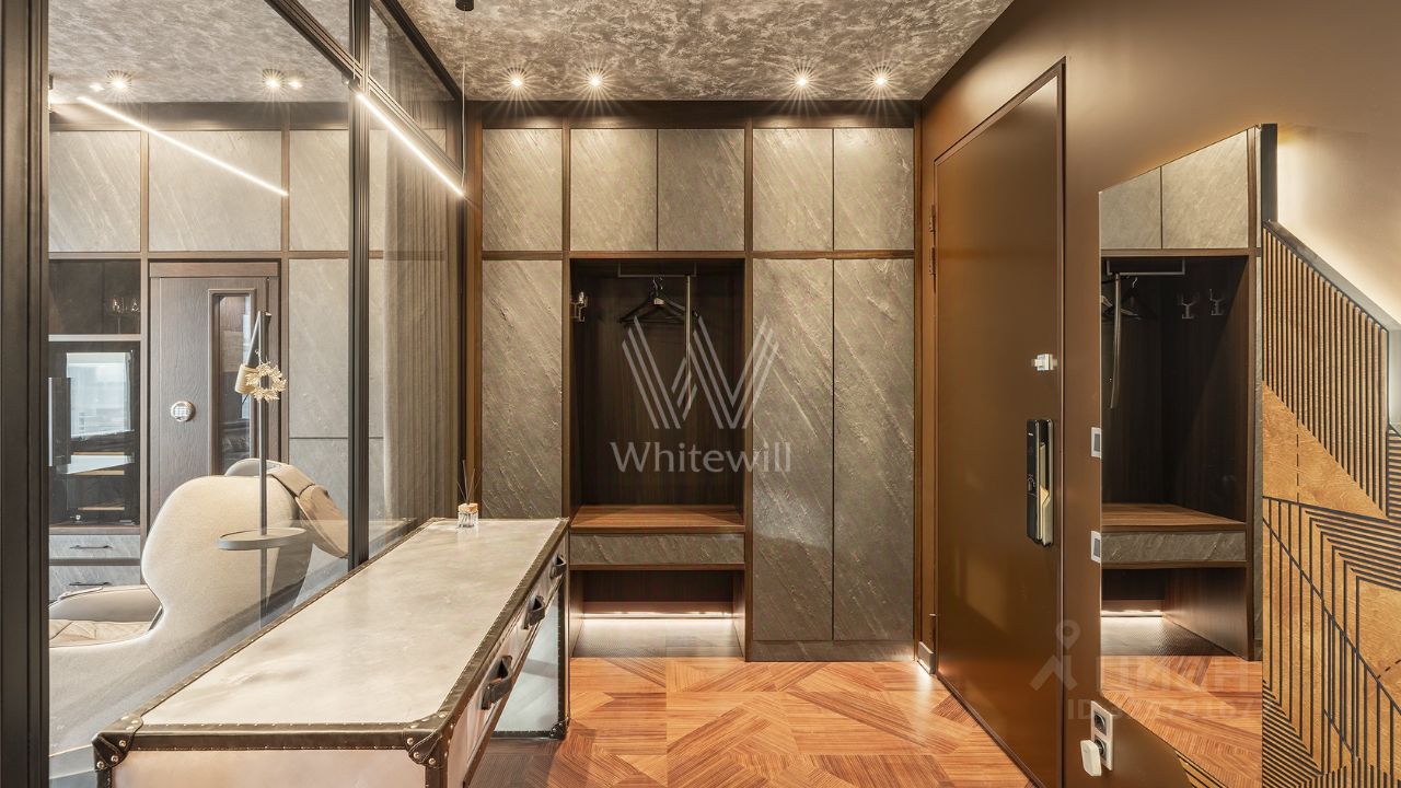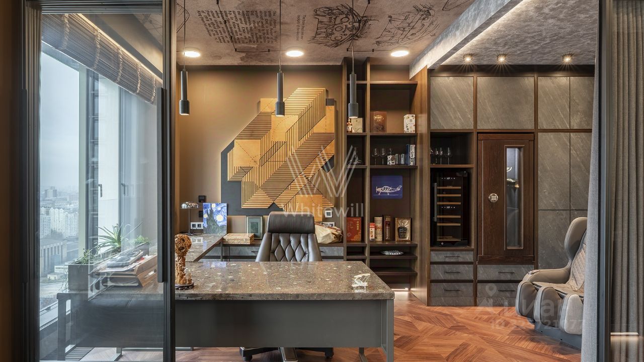 Квартира полностью меблирована и укомплектована бытовой техникой. Функциональная планировка включает кухню-гостиную с обеденной и ТВ зонами, спальню, кабинет, который можно оборудовать как вторую спальню, ванную комнату, гардеробную и холл. Благодаря панорамным окнам, ориентированным на две стороны, пространство наполнено естественным светом и теплом.