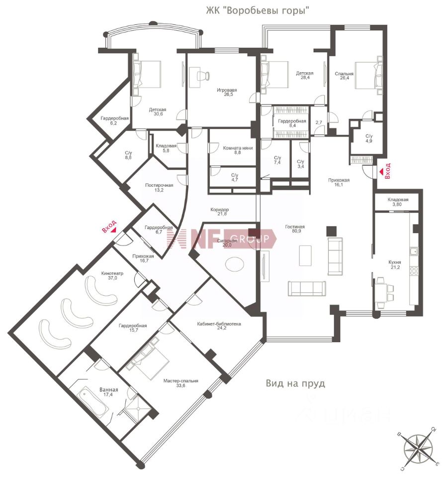 Лот: 78909. Эксклюзив NF GROUP. В продаже эксклюзивная 6-комнатная квартира площадью 492 м² в клубном доме Lake House в Раменках. Пространство спроектировано для комфортной жизни большой семьи: гостиная-столовая, кухня с кладовой, мастер-спальня с кабинетом, ванной и гардеробной, 3 детских (гостевых) спальни со своими санузлами и гардеробными, детская гостиная, кинозал, винно-сигарная комната, постирочная, спальня для няни. В квартире два независимых входа — для хозяев и для персонала, что обеспечивает высокий уровень комфорта и приватности. Выполнена отделка в стиле современной классики с использованием премиальных материалов и мебели брендов Baker, Ralph Lauren, J Robert Scott. Улучшенная шумоизоляция, потолки — 3 м. Возможна покупка машино-места и кладовой в подземном паркинге. Из окон открываются виды на пруд и зелёный двор. Для жителей — фитнес зал, переговорная зона, детская комната и закрытая благоустроенная территория с прямым выходом к Мосфильмовскому пруду. Рядом Воробьёвы горы, Матвеевский лес и долина реки Сетунь — природа и тишина в нескольких минутах от центра Москвы.