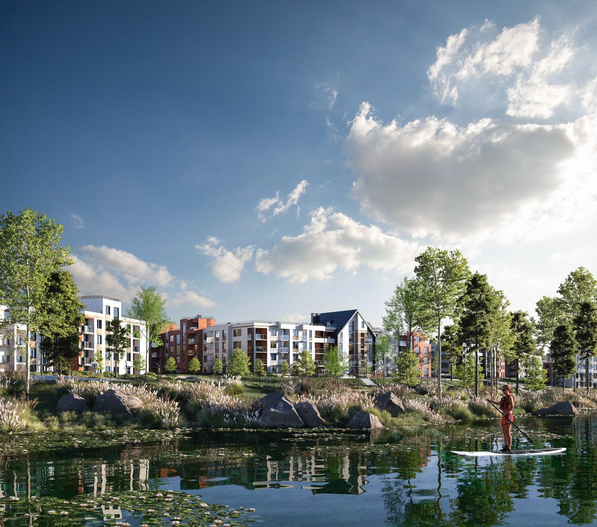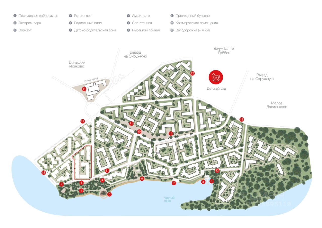 Набережная: собственная набережная вдоль пруда с детскими игровыми зонами, экстрим-парком, местом для занятия йогой, пирсом и амфитеатром.