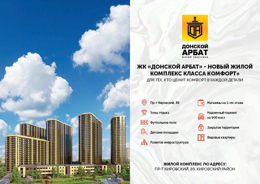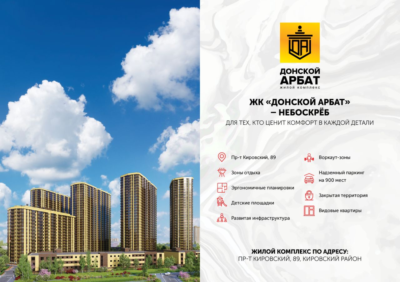 Жилой комплекс-небоскрёб ''Донской Арбат'' в центральном Кировском районе, в непосредственной близости к Ростовскому ипподрому, по адресу, пр-кт. Кировский, 89. В жилом комплексе пять многоквартирных домов различной этажности и конфигурации, также в проекте есть множество особенностей:
