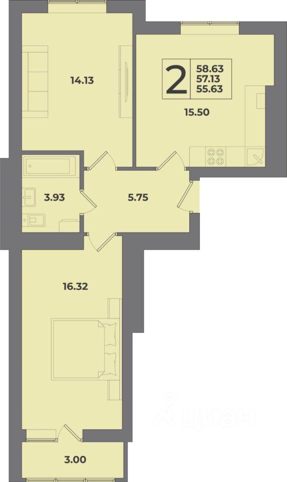 Общая площадь58,63 м2
