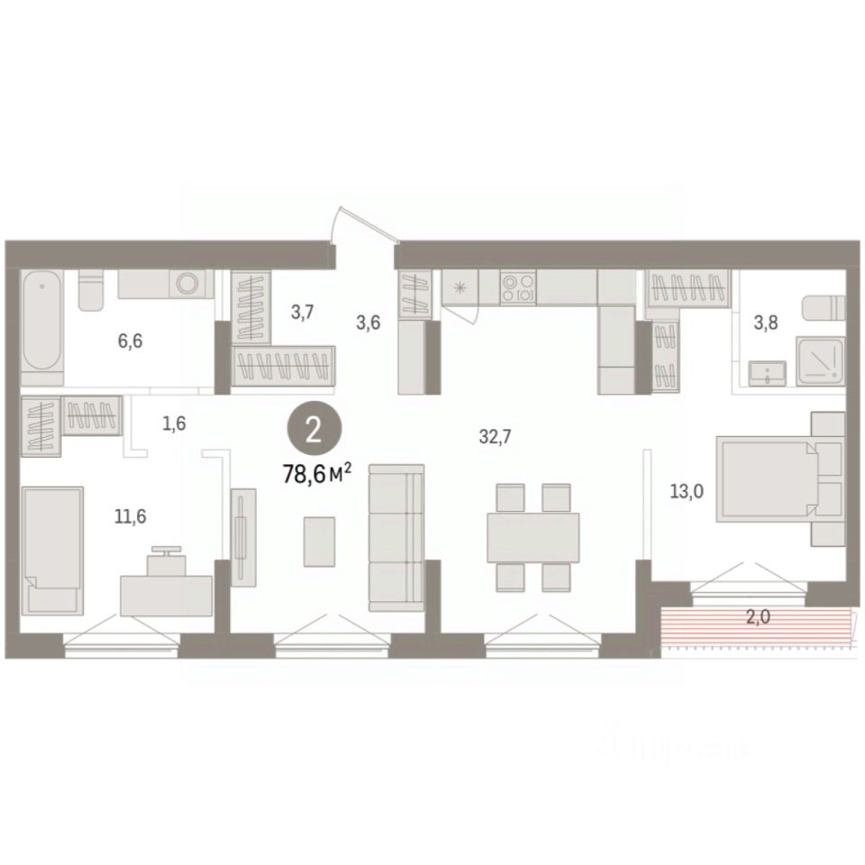 Квартира с кухней-гостиной и двумя спальнями в квартале Авиатор. Особенности планировки: разнесённые спальни, свободная планировка, терраса на крыше. квартиры в нашей базе: АВТ03-Ж2.8.2.