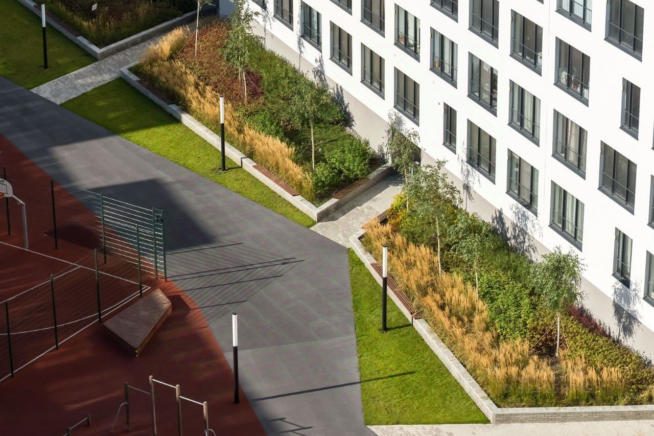 Первые этажи вдоль Мочищенского шоссе и улицы Аэропорт мы отдали под полезные сервисы и магазины. Активный фронт позволил интегрировать квартал в городской контекст. На территории ''Авиатора'' расположен многофункциональный спортивный комплекс с открытым амфитеатром, который станет центром притяжения всего района.