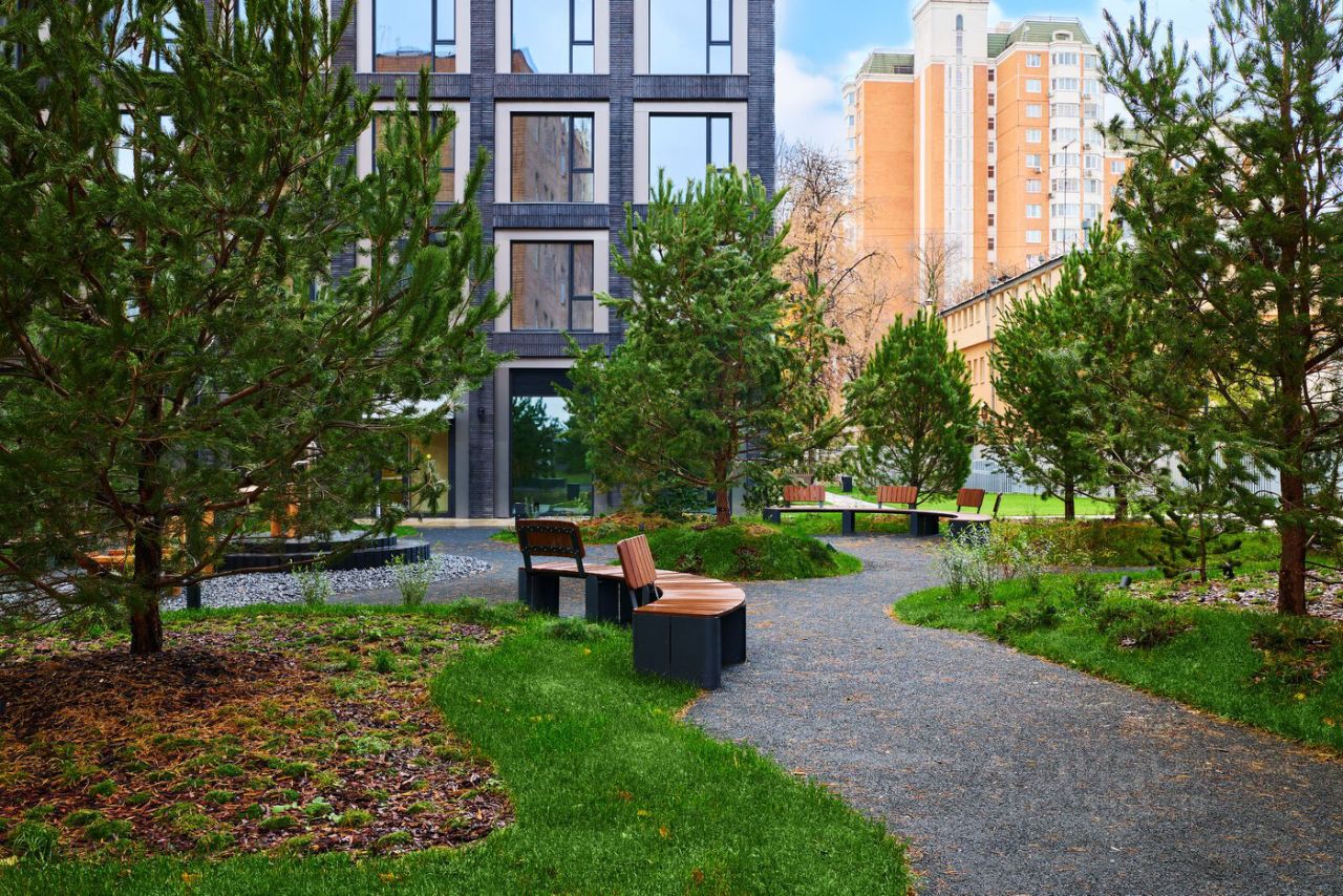 Благоустройство: Концепция благоустройства создана в соавторстве с именитым бюро GAFA. На площади 0,35 га расположатся зоны для отдыха, занятий спортом и прогулок. Во дворе для жителей жилого комплекса будет создан коворкинг прямо на свежем воздухе - открытые беседки и Wi-Fi на территории. Атмосферу приватности подчеркнёт обилие растительности - деревья и кустарники займут 50% двора. За счёт большого количества хвойных насаждений территория жилого комплекса будет зелёной круглый год.
