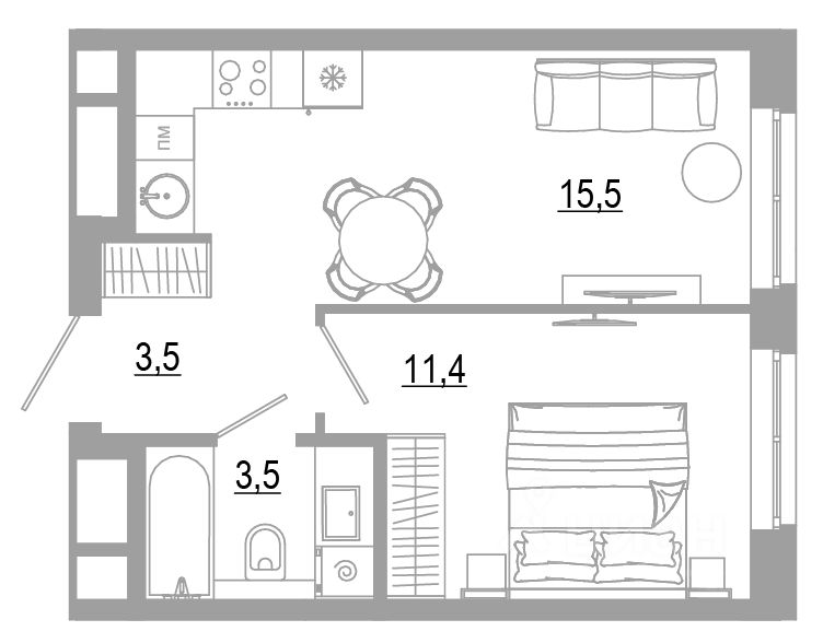 \- квартиры с кухней-гостиной и отдельной комнатой,