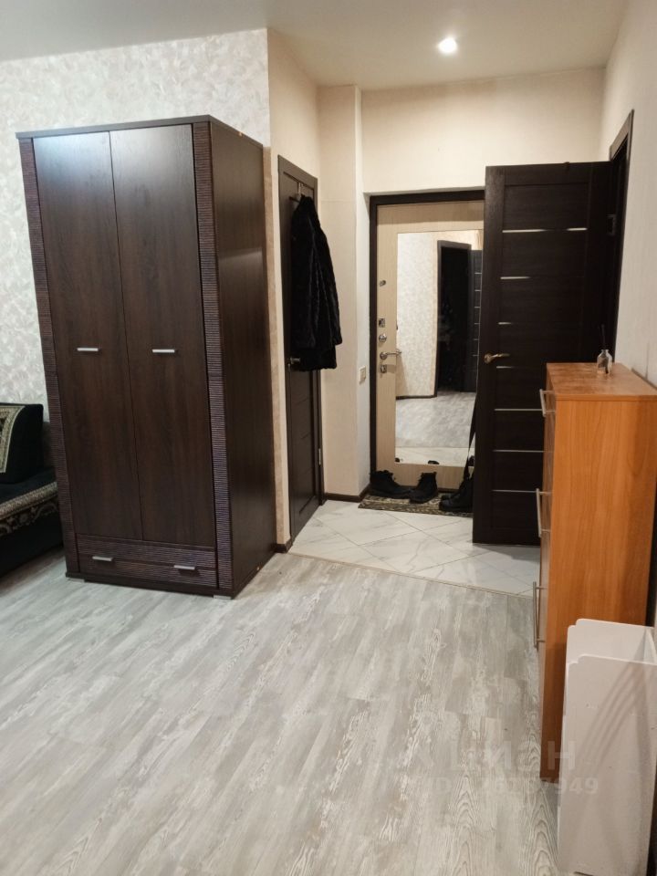 В гостиной установлен удобный диван и вместительный шкаф. Из мебели также имеются шкафы в спальне и гардеробная. Кухня оборудована всем необходимым: холодильник, микроволновая печь, плита и обеденный стол. Ванная комната совмещена и оформлена плиткой, создавая ощущение чистоты и уюта.